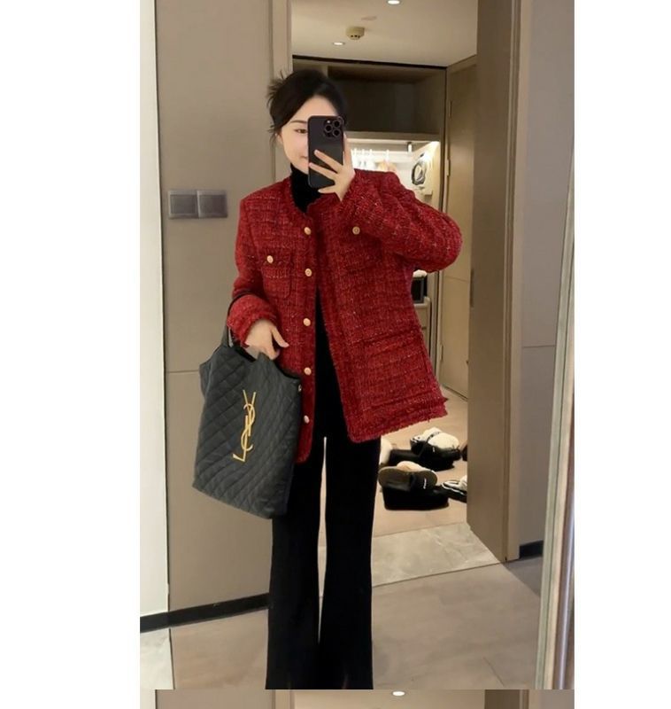 秋冬大码女装胖mm名媛红色小香风外套微胖妹妹中长款炸街显瘦上衣