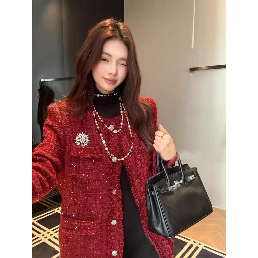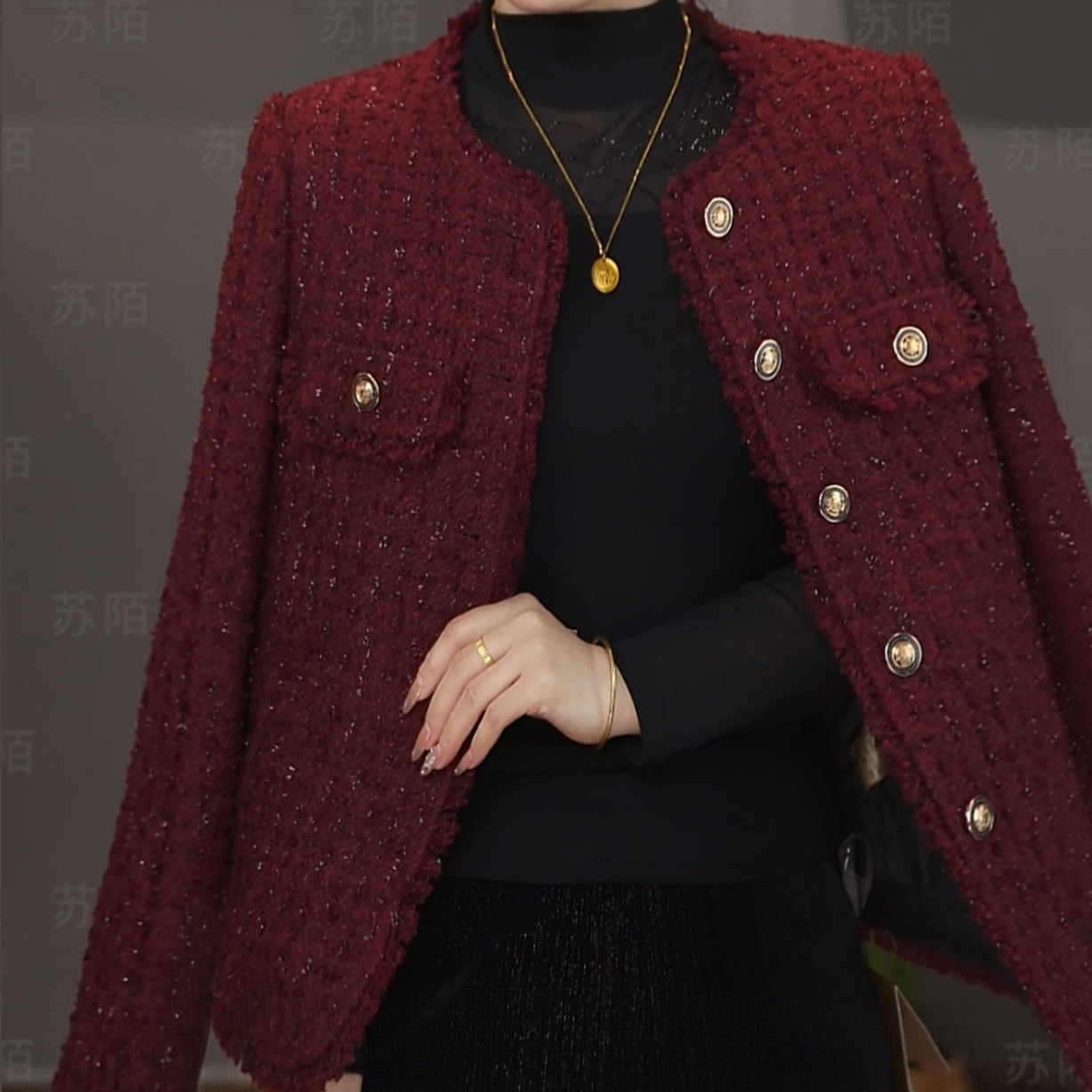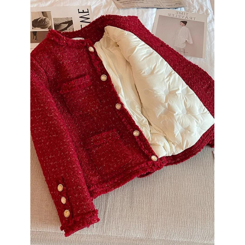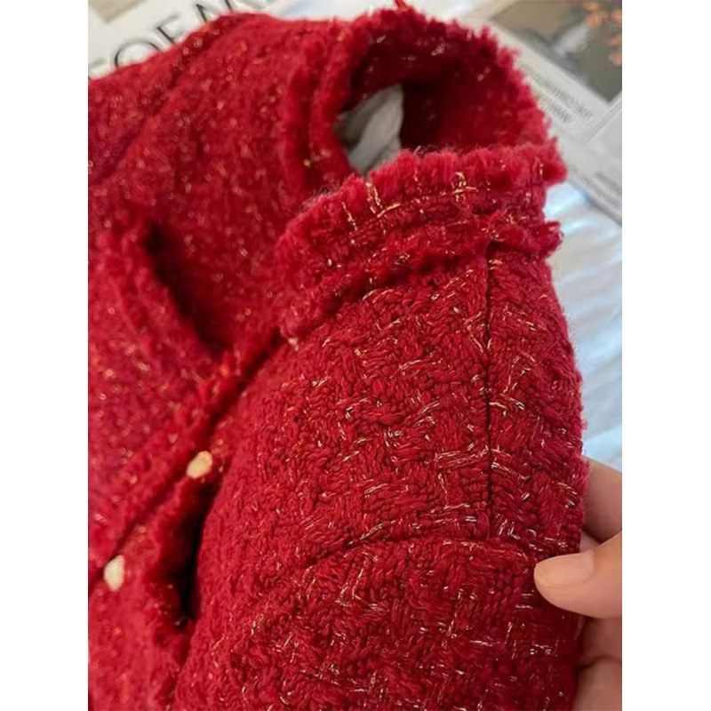 酒红色小香风外套女秋冬2025新款小个子名媛加厚短款本命年羽绒棉