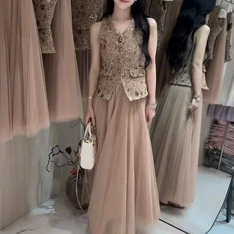 2026年夏新作ファッション、重厚なスパンコール付きVネックノースリーブ、小香風ベストとハイウエストメッシュスカートのセット