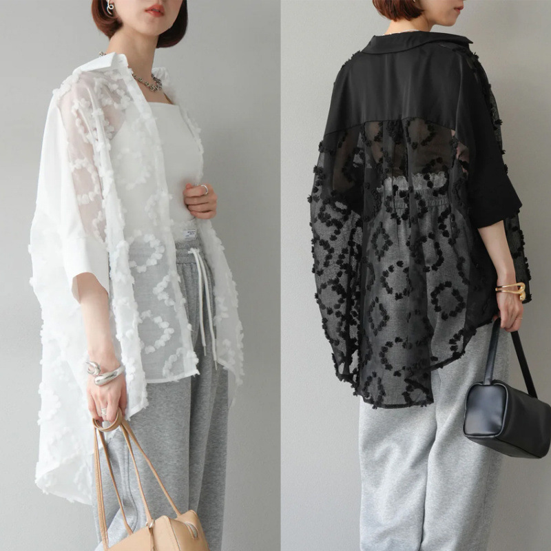大量の既製品のヘビー刺繍ルーズ日焼け止めレーストップス、ファッショナブルなエアコンシャツ、レイヤードブラウスのリアルショット