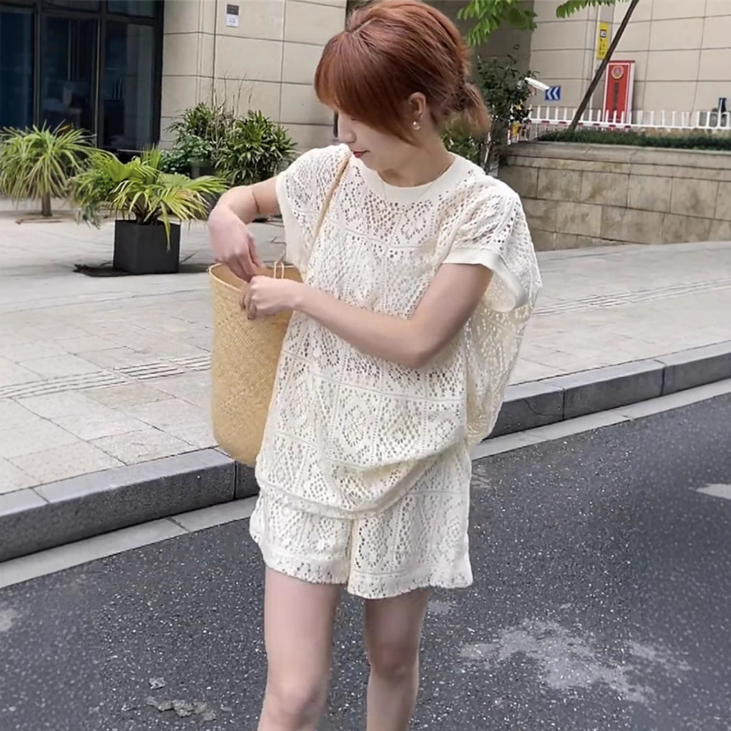 ヘビーデューティ中空レーススーツ女性のルーズカジュアル半袖トップショーツツーピースセット 2024 夏の新しい婦人服
