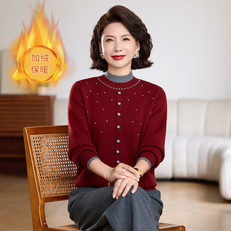2023秋冬妈妈毛衣女加绒加厚现在针织衫中老年保暖打底衫一件代发