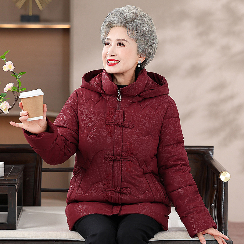 お年寄りのダウンジャケットの女性の短いタイプの本命年のお母さんの冬服の綿入れの上着の老人の唐服のおばあさんの冬の綿入れの上着
