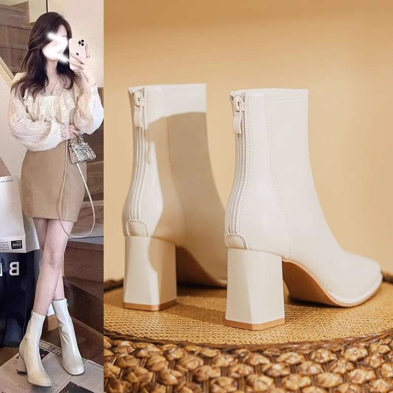 女性用の白い小さな純粋な欲望スタイルのフレンチショートブーツ、太いヒール、ミッドレングス、レトロな気質のショートブーツ、ハイヒールのショートブーツ