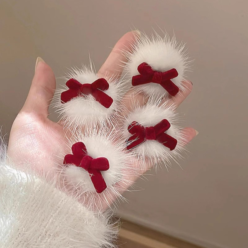 新年红蝴蝶结毛绒发夹女2025新款秋冬碎发刘海夹毛毛球鸭嘴夹批发
