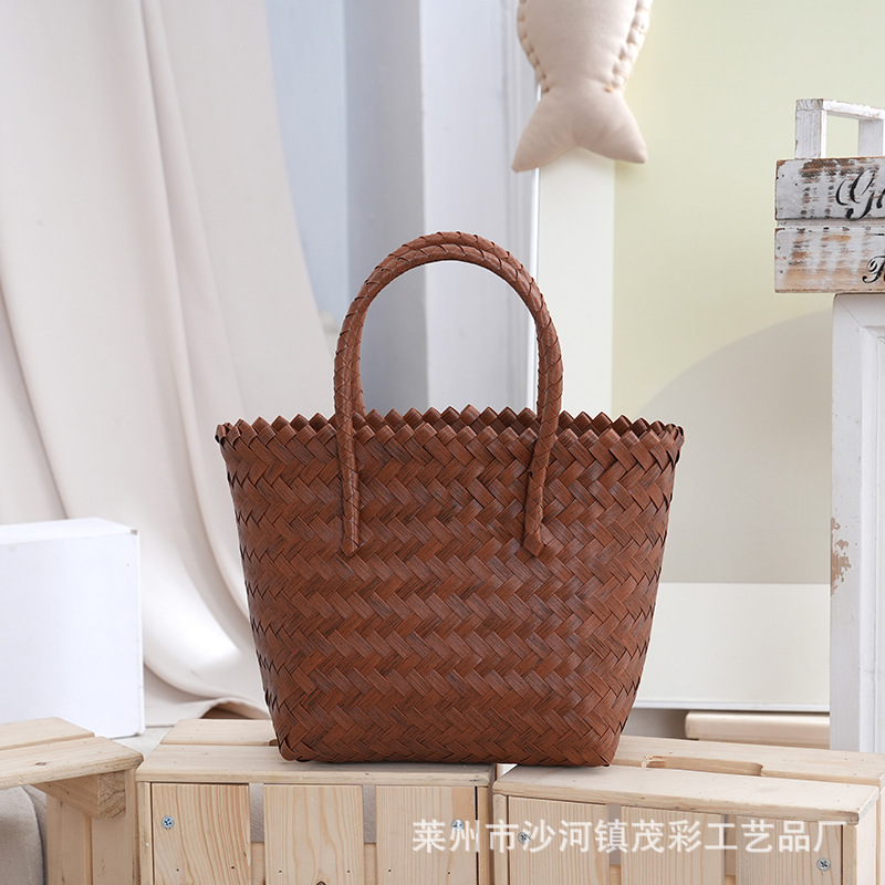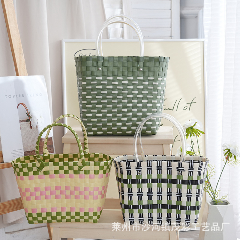 レトロPP手織り野菜バスケット大容量百合レジャーハンドバッグお土産バスケット海辺ビーチバッグ