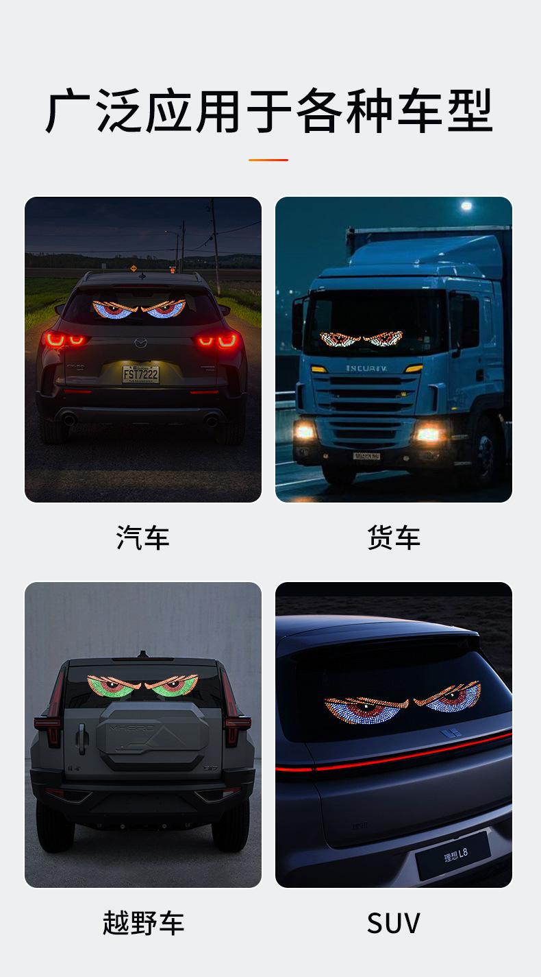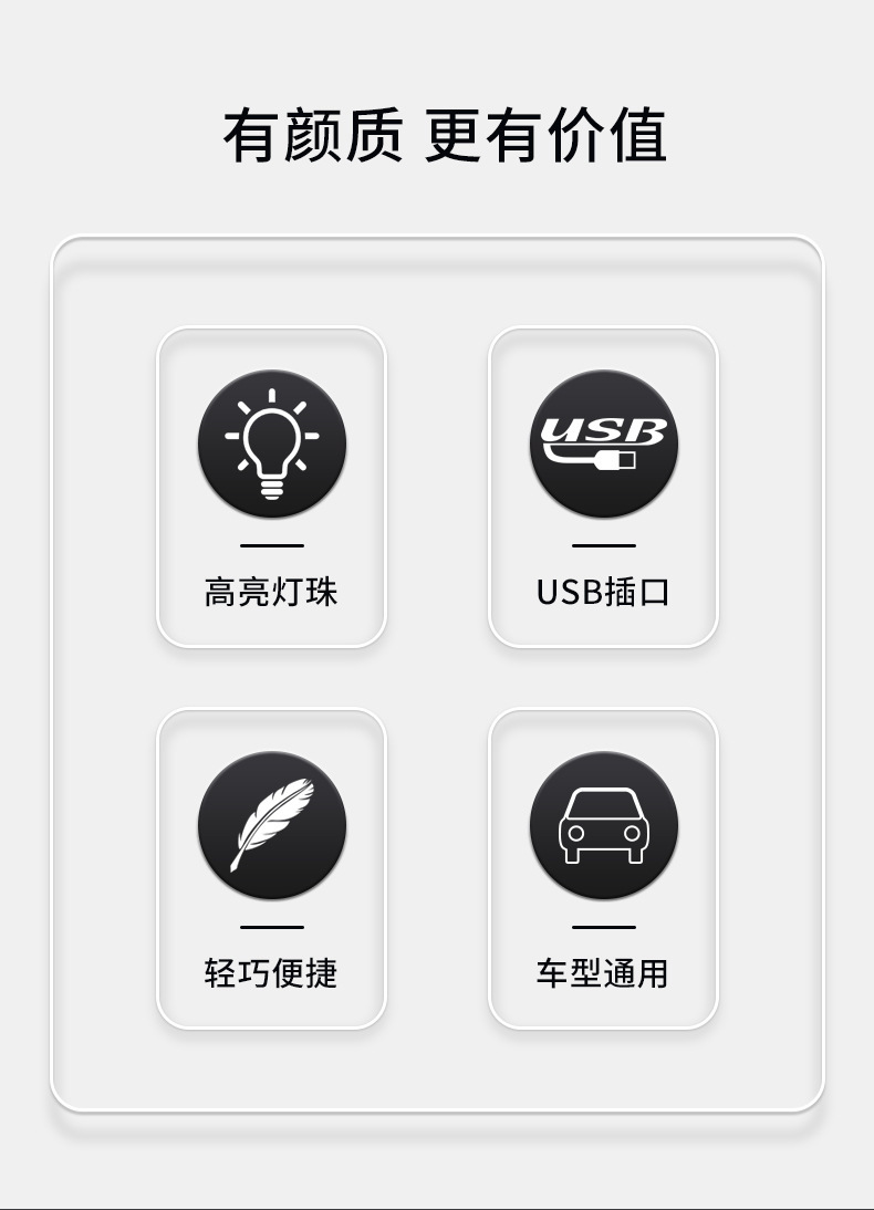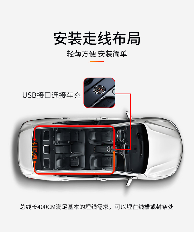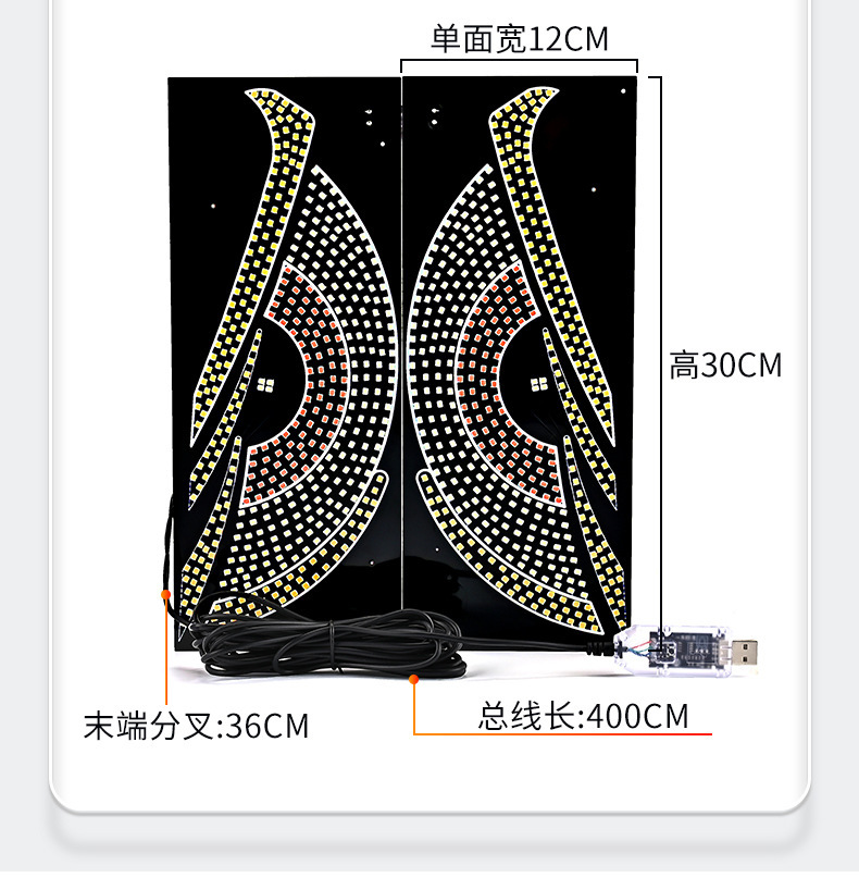 这个是灯珠氛围灯,单面长度30CM 宽度12CM 。有2片,二合一USB线,线长4米。不挑车型,线可以埋在线槽或顶棚的封边条处。直接链接到USB供电,或充电宝供电。灯牌背面使用自带无痕胶黏贴,可无损安装,不会残留。有1个常亮和10个爆闪模式切换,通过按钮切换。不能链接手机哦!