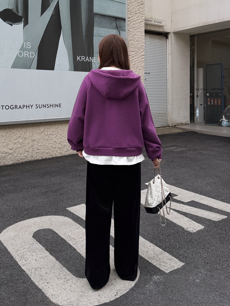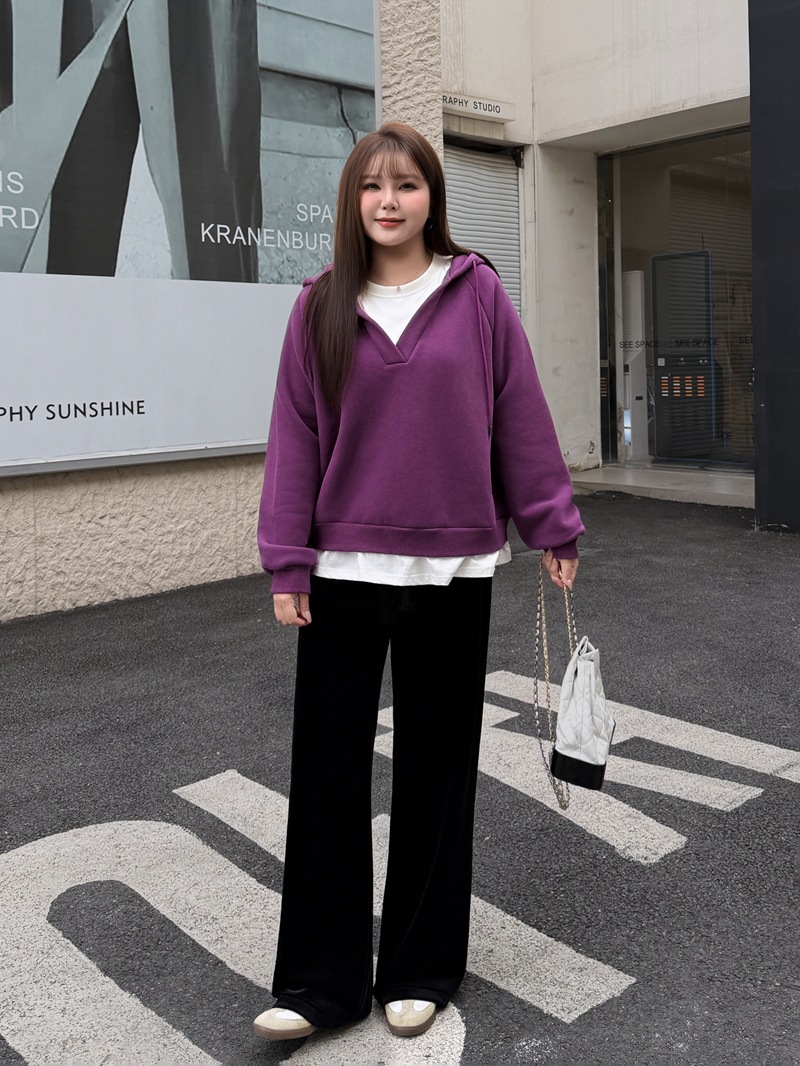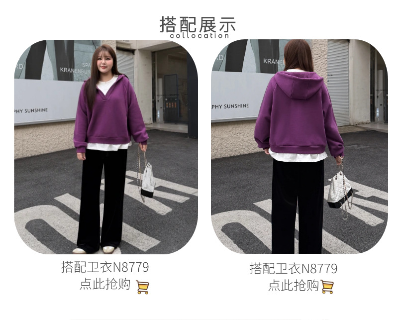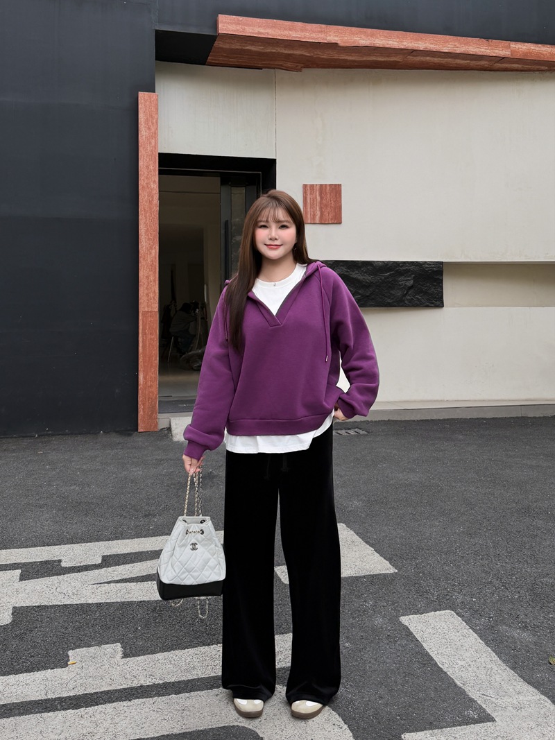加绒假两件连帽插肩袖卫衣润其8779大码蓝莓紫酱冬款保暖宽松叠穿