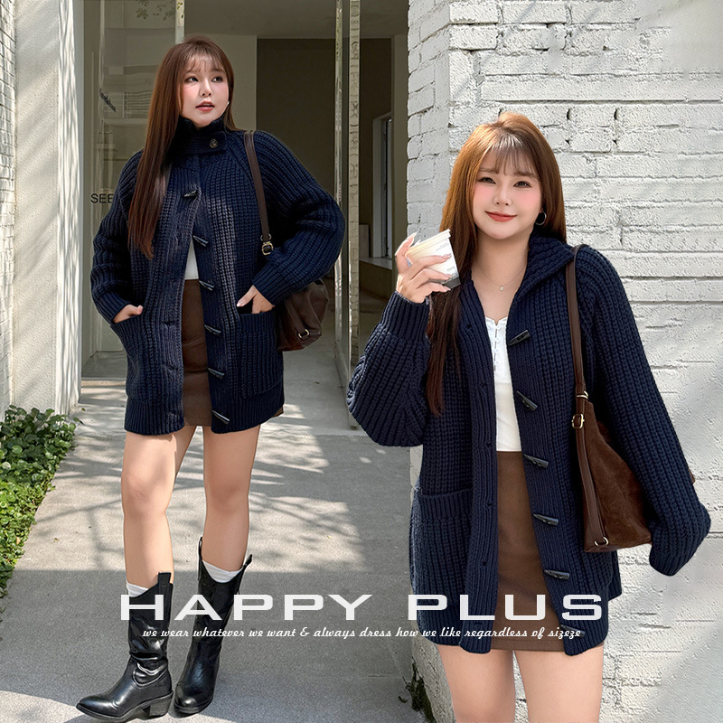 松系休闲重磅手工粗针立领牛角扣毛衣外套润其9286大码softcore套
