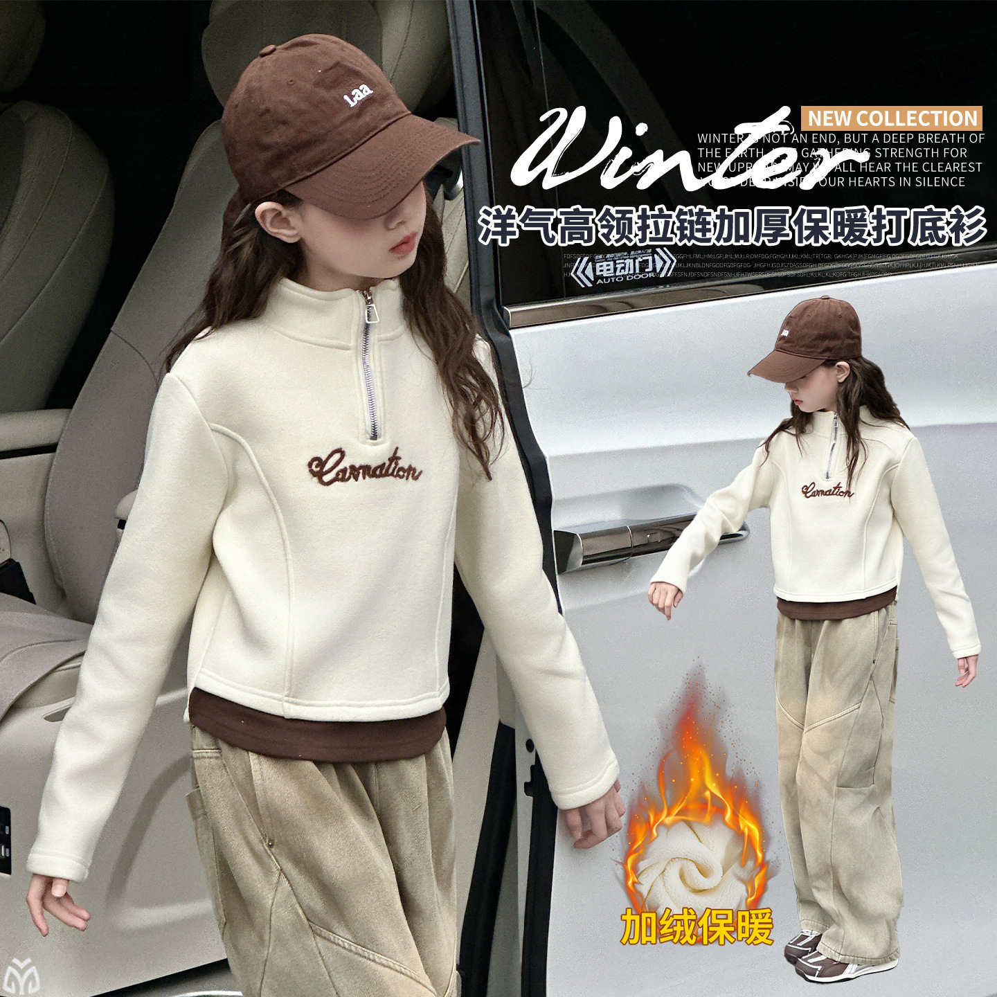 女童秋冬加厚打底衫中大童洋气半拉链上衣儿童百搭加绒保暖绒衫潮