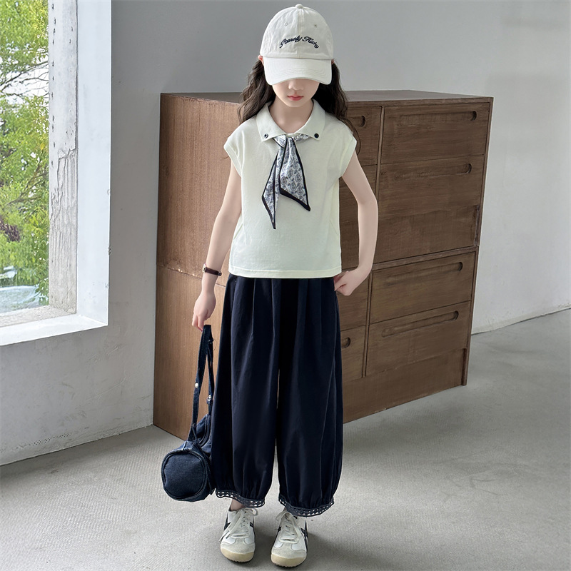 女の子ノースリーブスーツ夏 2025 新しい中型および大型子供韓国ポロシャツトップ夏子供ショーツ 2 点セット