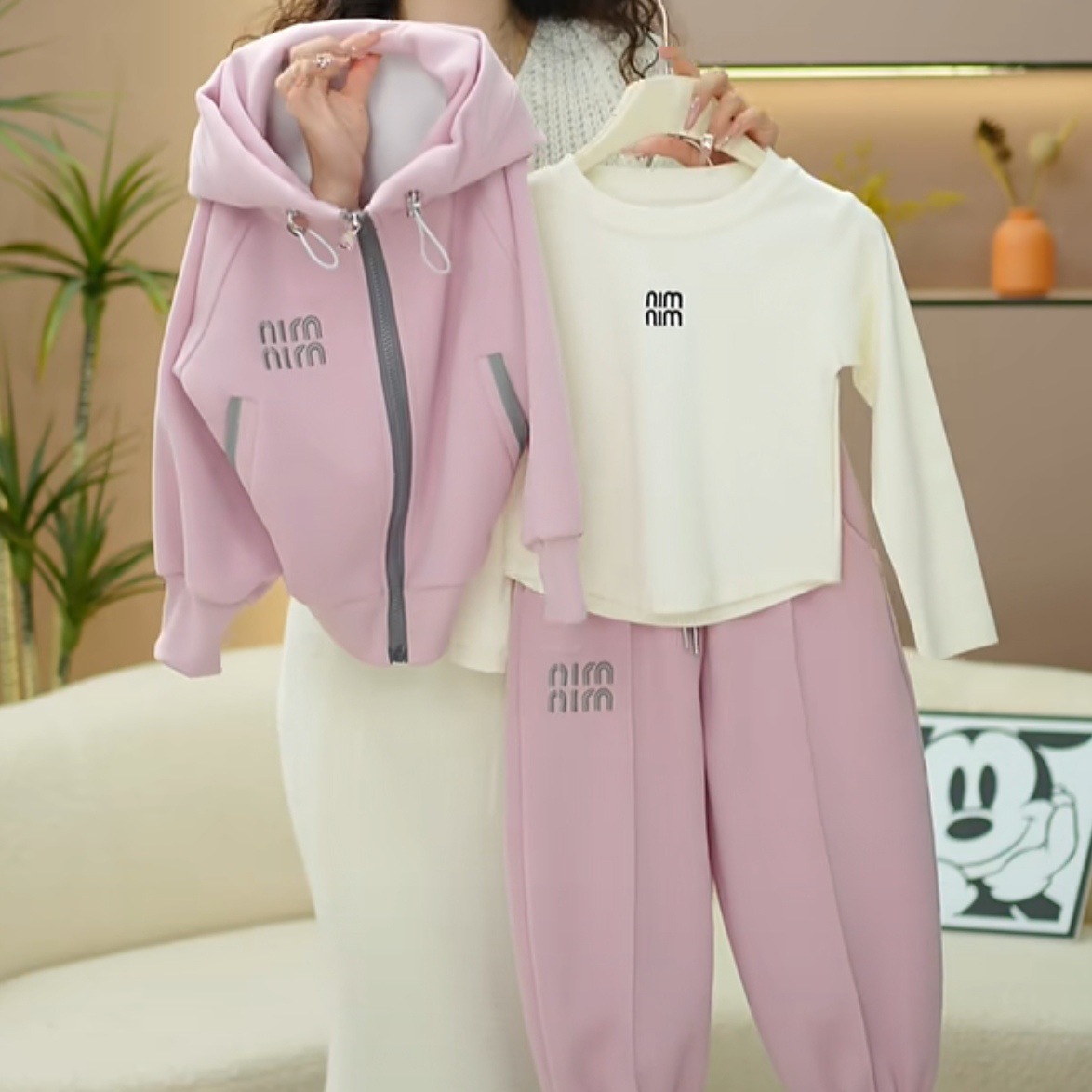 女の子カジュアル刺繍衛衣ズボンセット春秋2025新型帽子付きカーディガンコート運動足首ズボン淑