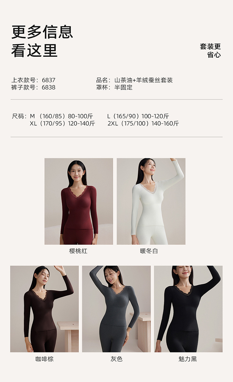 2025秋冬保暖长袖女V领蕾丝固定杯羊绒蚕丝贴片长袖长裤保暖套装