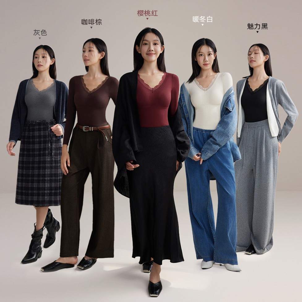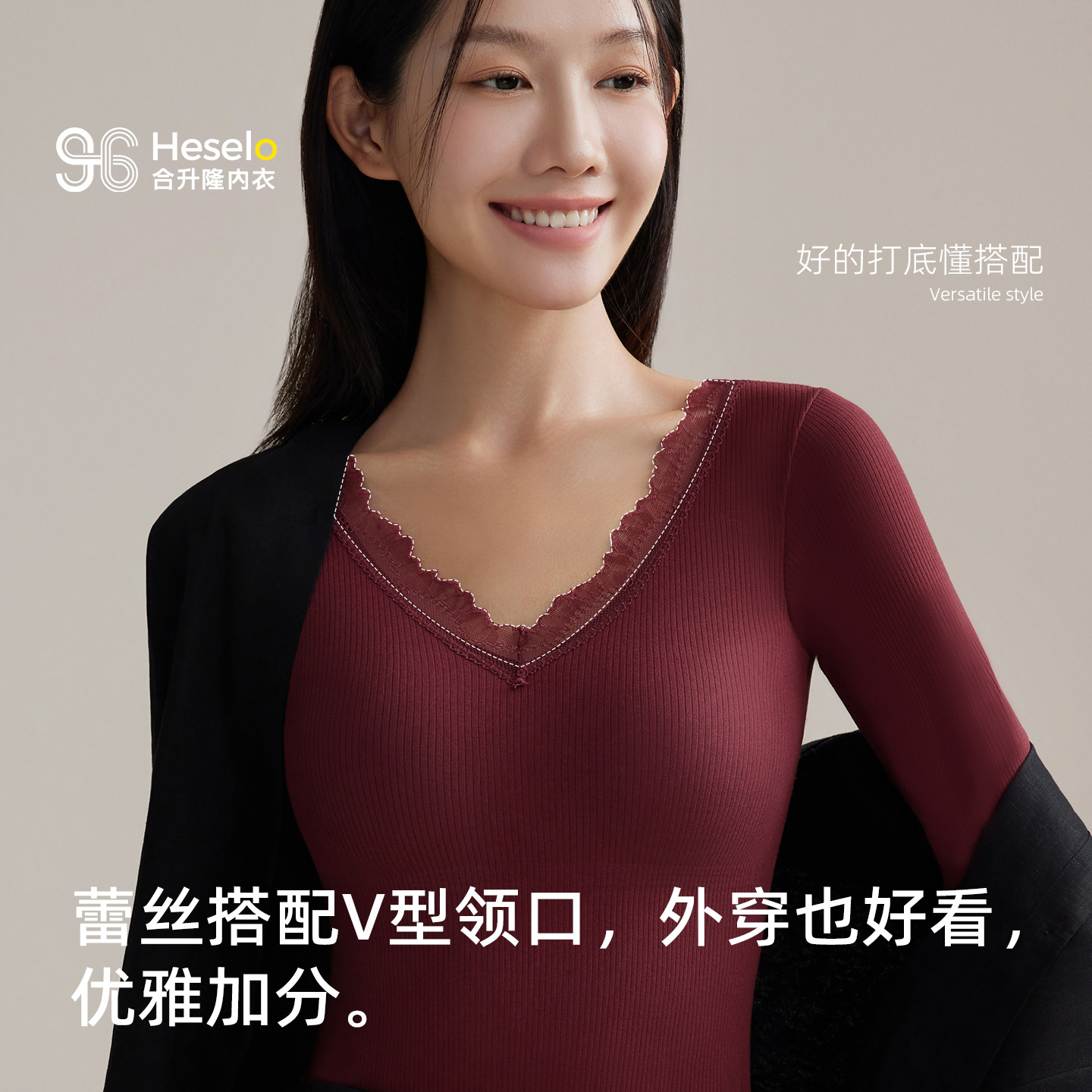 秋冬美肤衣套装蕾丝V领自带胸垫隐形无痕高弹山茶花女士内搭保暖