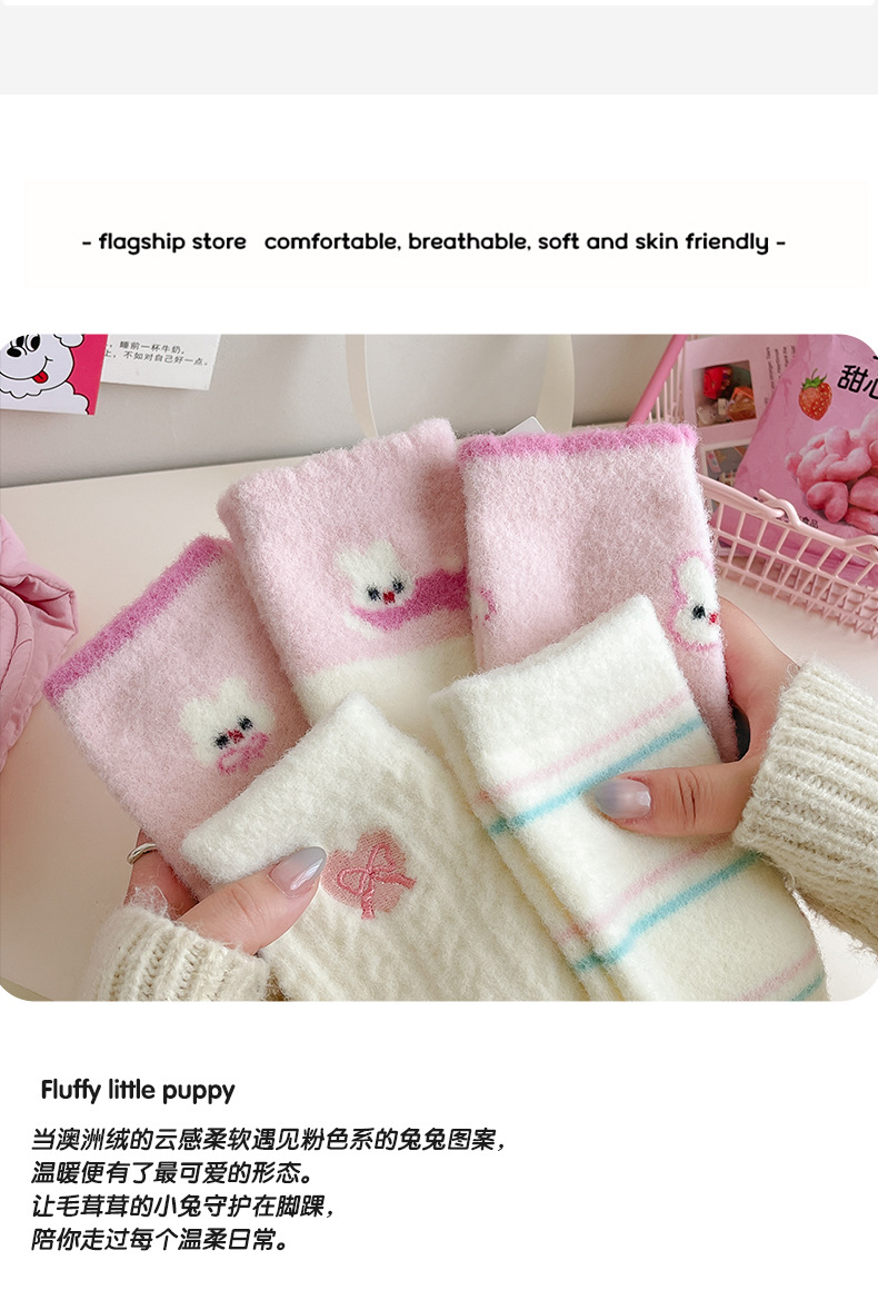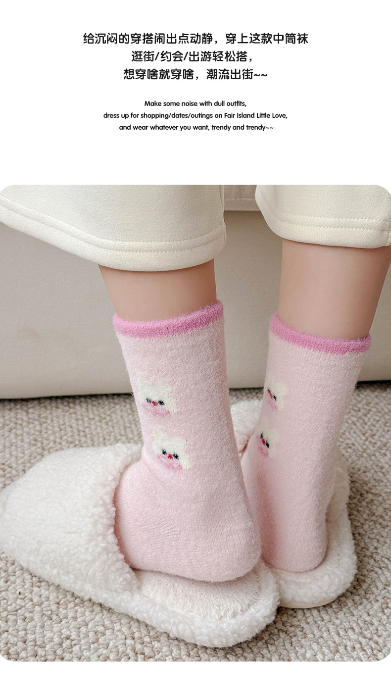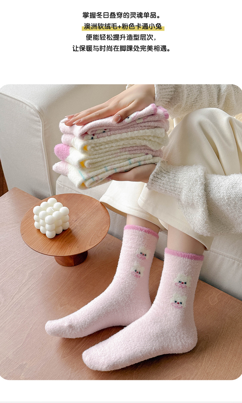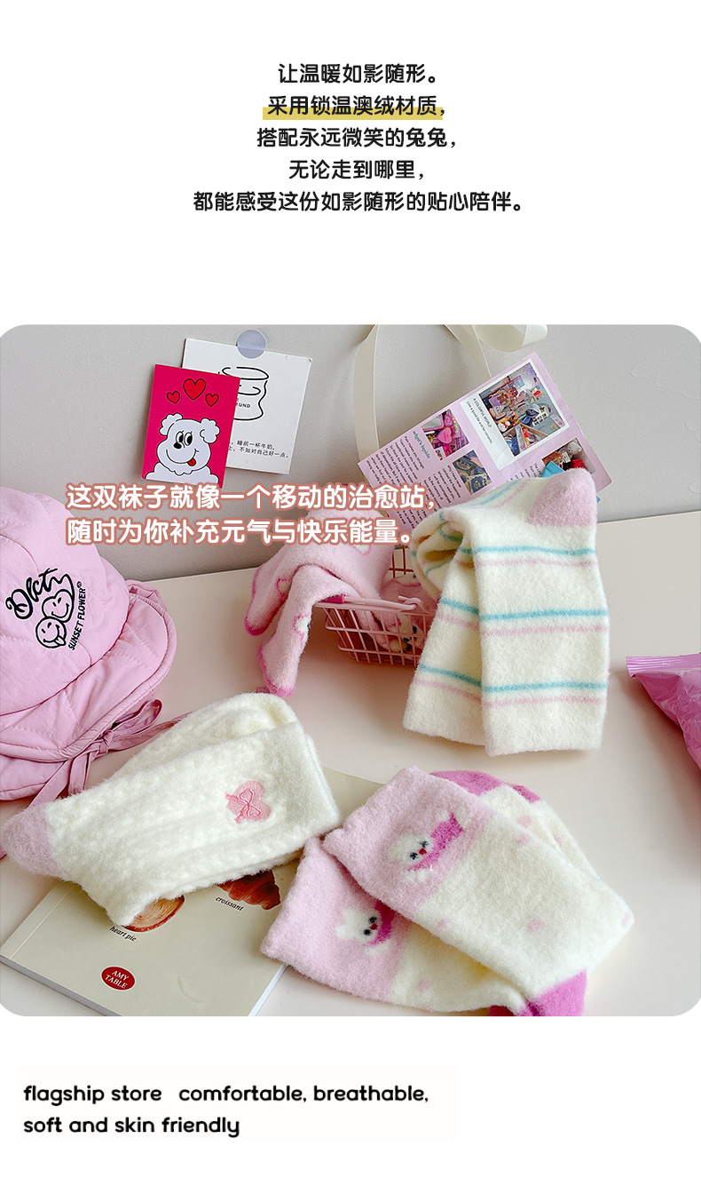 澳绒袜子女秋冬季加绒加厚中筒袜保暖不冻脚可爱粉兔子家居地板袜