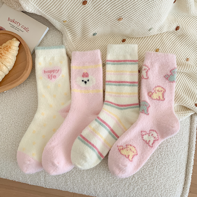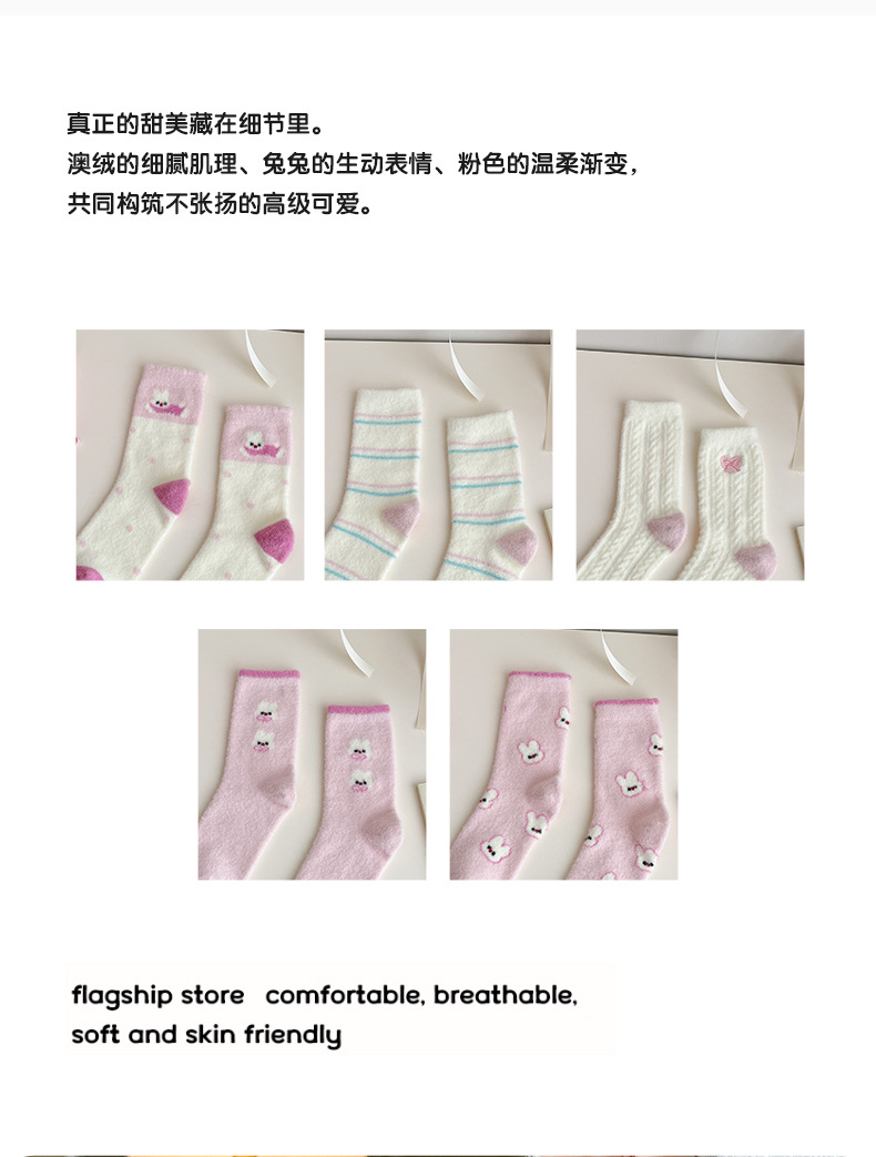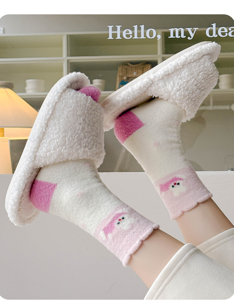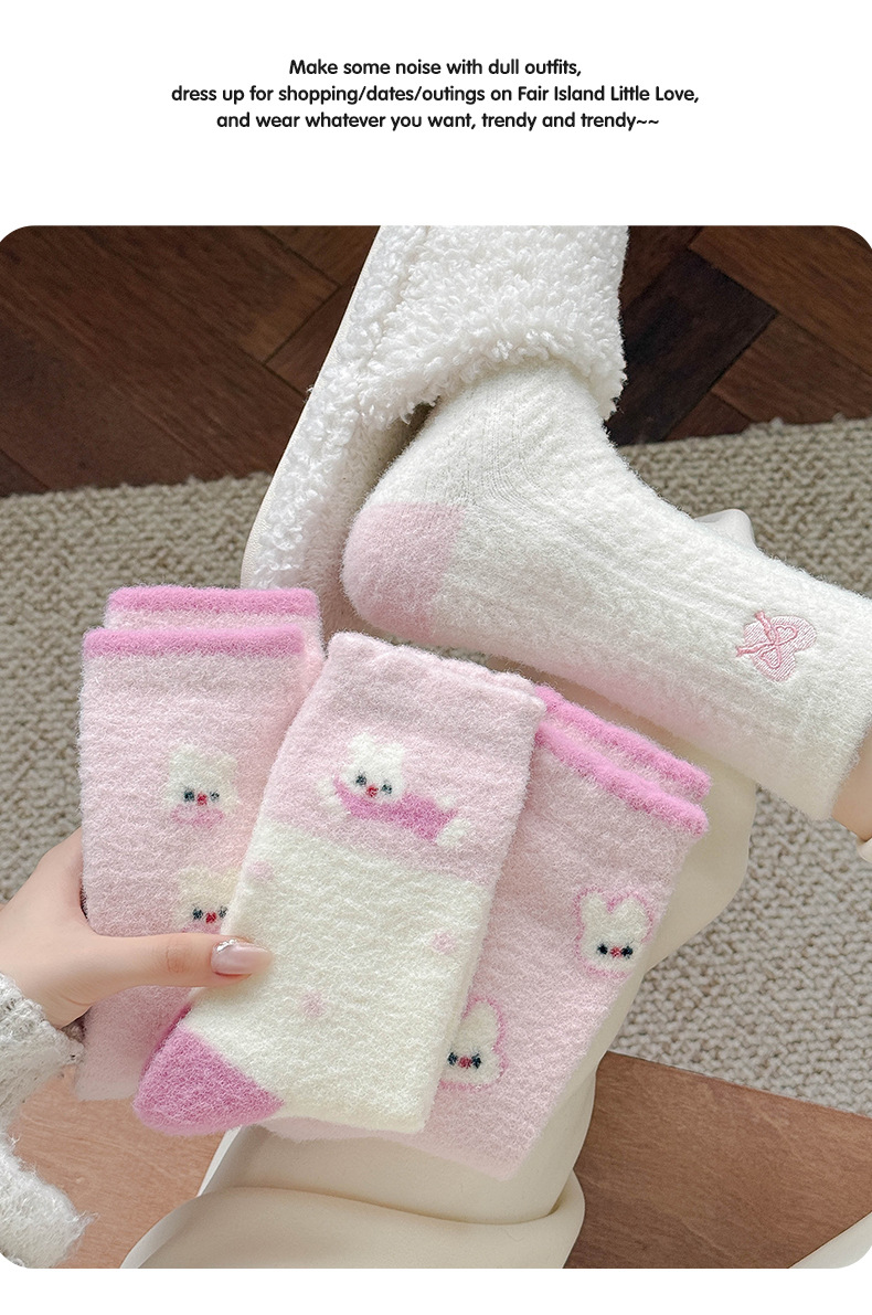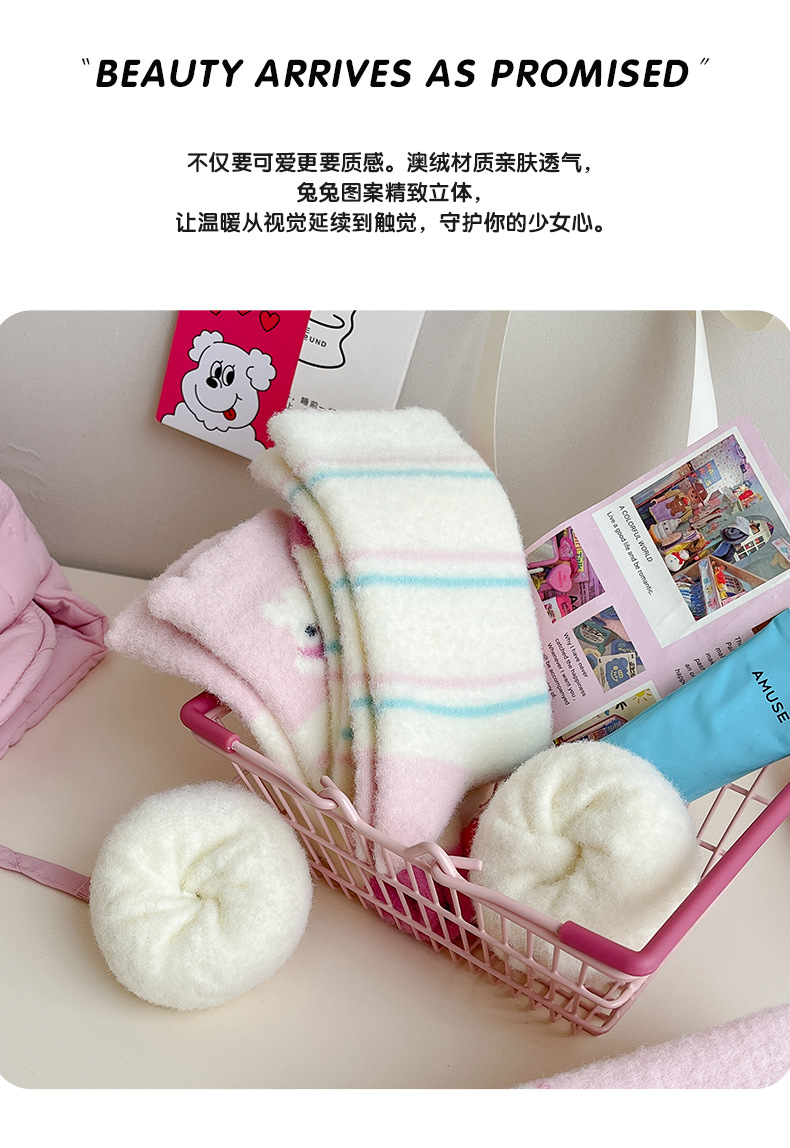 澳绒袜子女秋冬季加绒加厚中筒袜保暖不冻脚可爱粉兔子家居地板袜