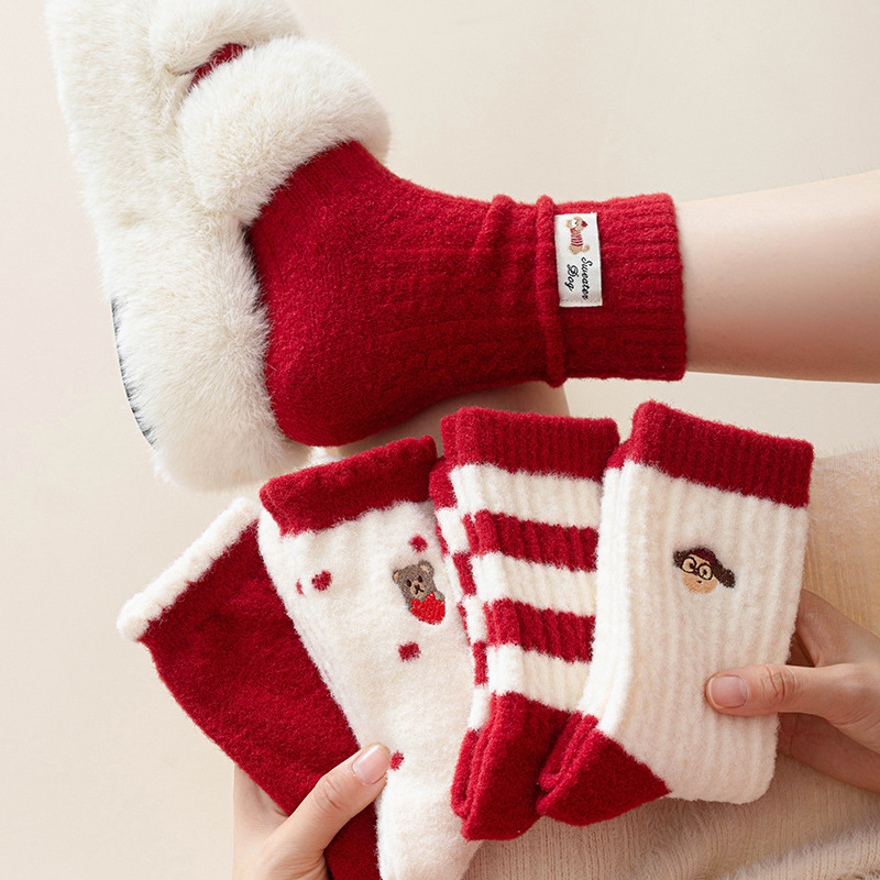 秋冬季澳绒红色袜子女条纹中筒袜加绒加厚保暖冬天居家地板睡眠袜