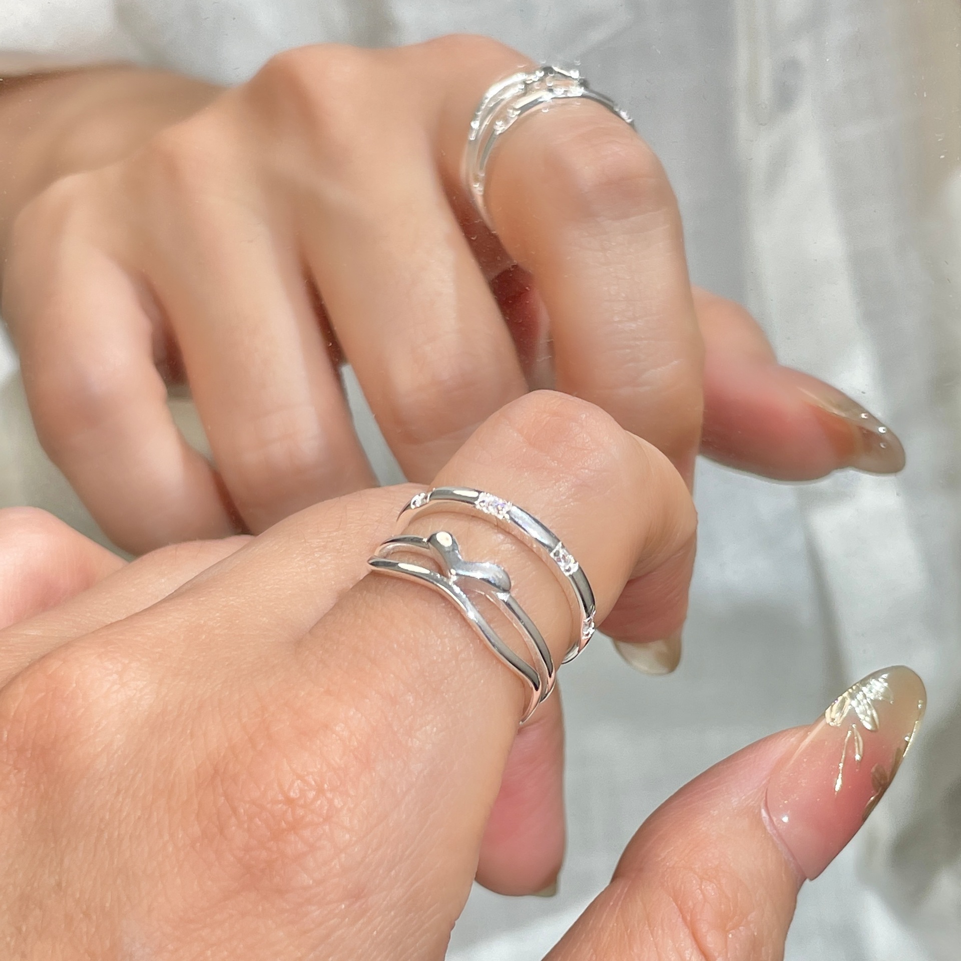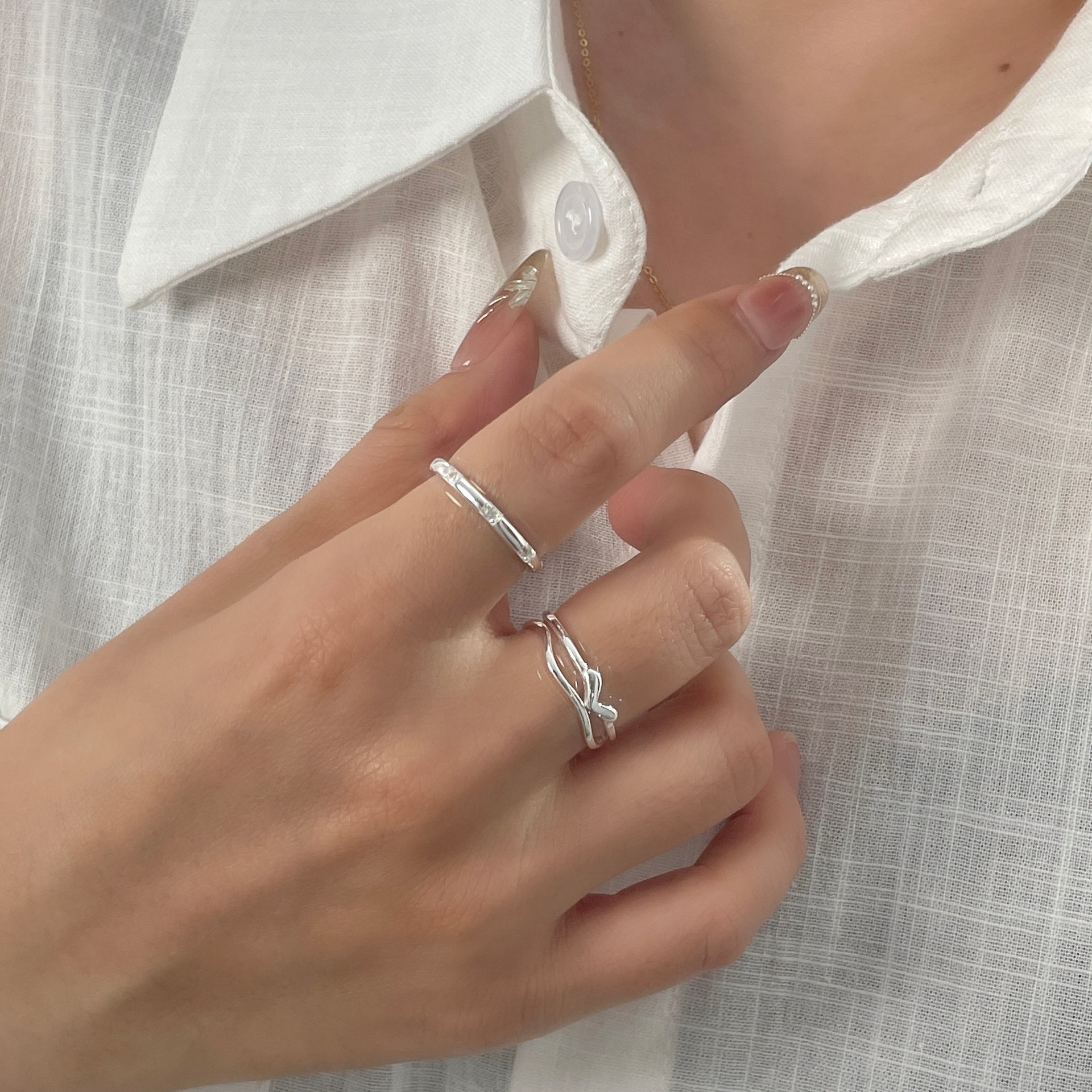 s925纯银小众设计高级感不规则褶皱戒指韩版ins叠戴风素圈开口戒