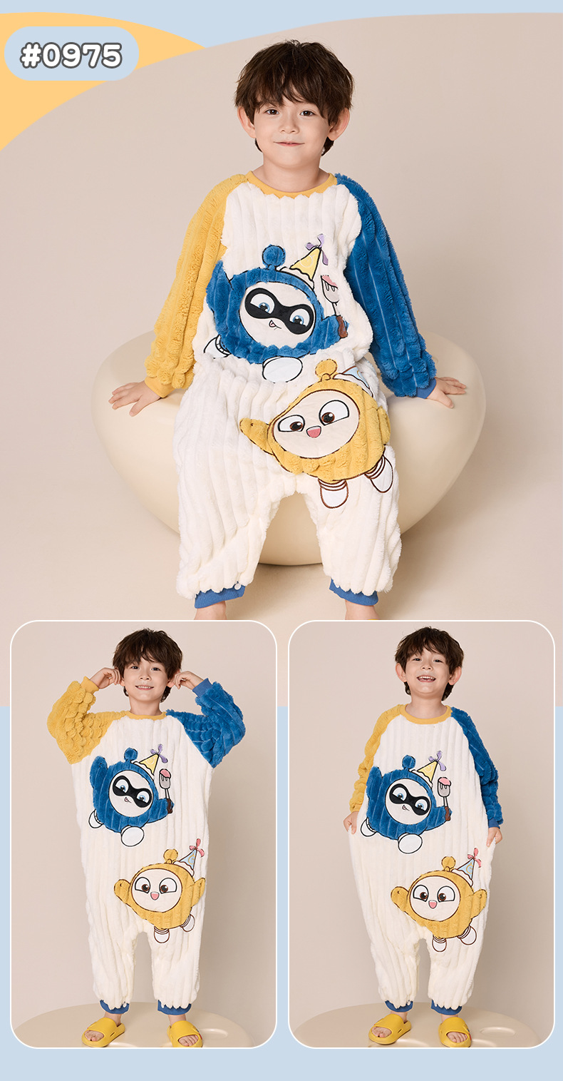 儿童连体睡衣男童秋冬季法兰绒加厚小男孩防踢珊瑚绒中大童家居服
