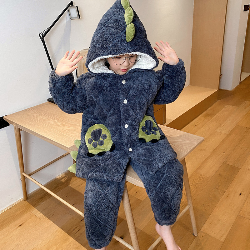 儿童睡衣秋冬季夹棉长袖带帽衫加厚男童套装卡通可爱可外穿家居服