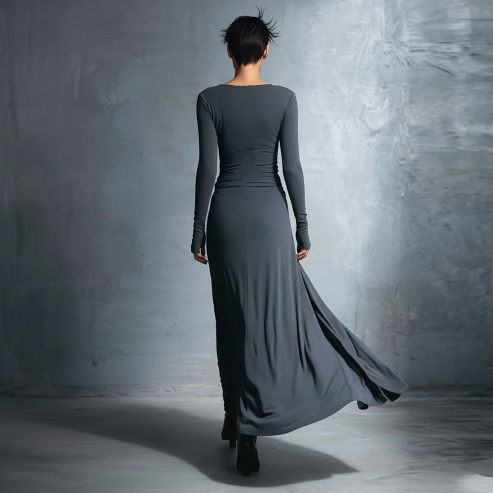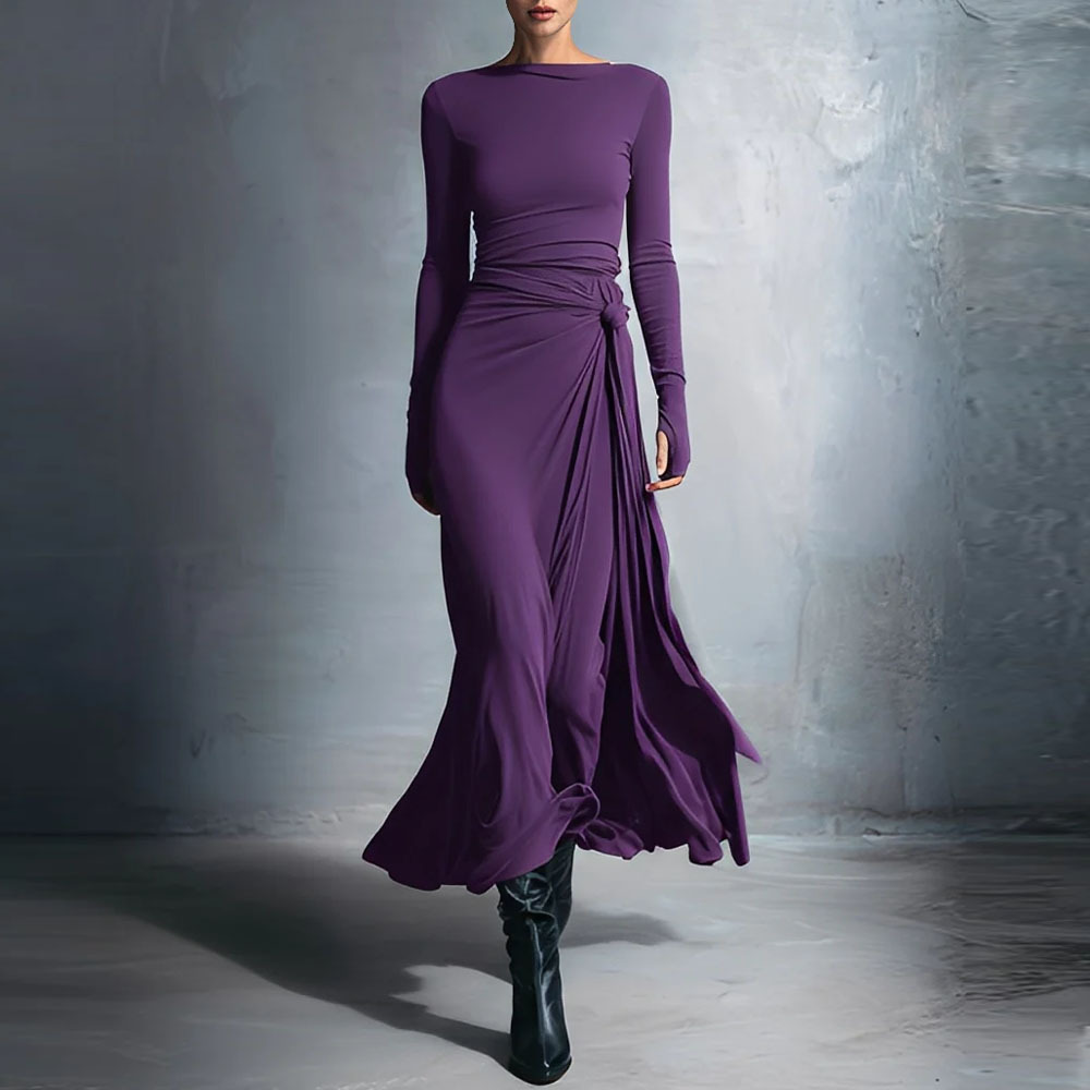 独立站欧美2025跨境秋冬新品女装纯色精致裹身长裙结饰长袖连衣裙