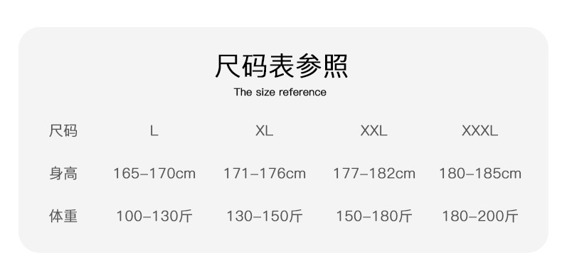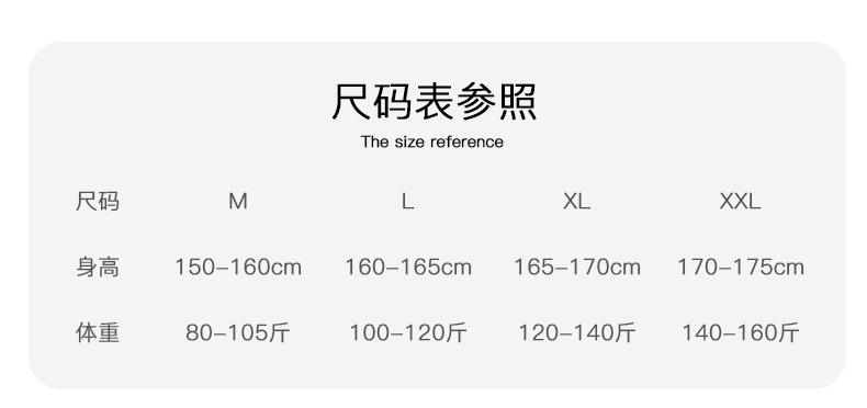 尺码 女M(80-100斤),女L(100-120斤),女XL(120-140斤),女XXL(140-160斤),男L(100-130斤),男XL(130-150斤),男XXL(150-180斤),男3XL(180-200斤)