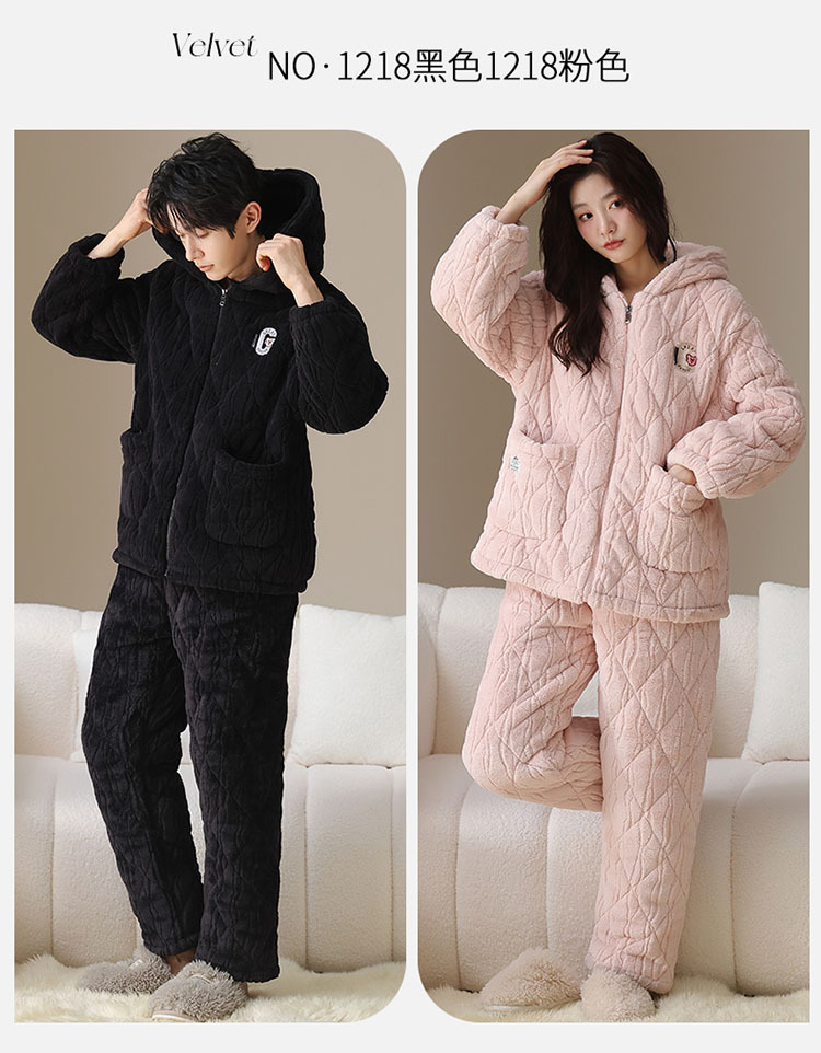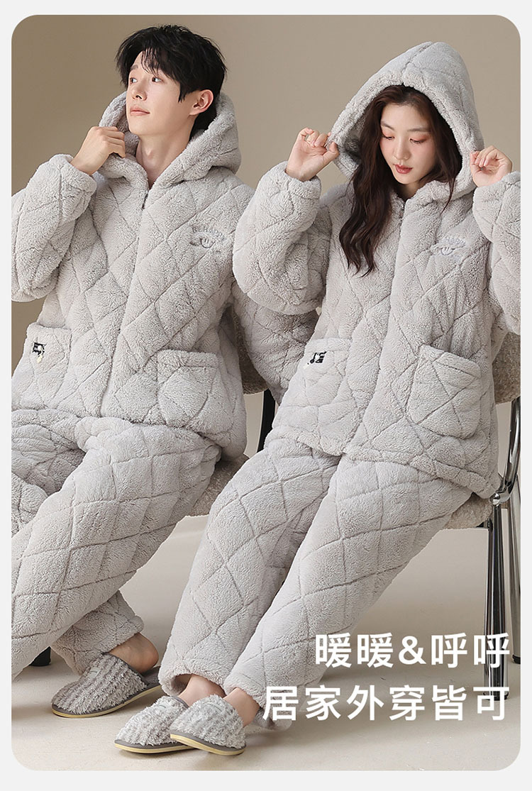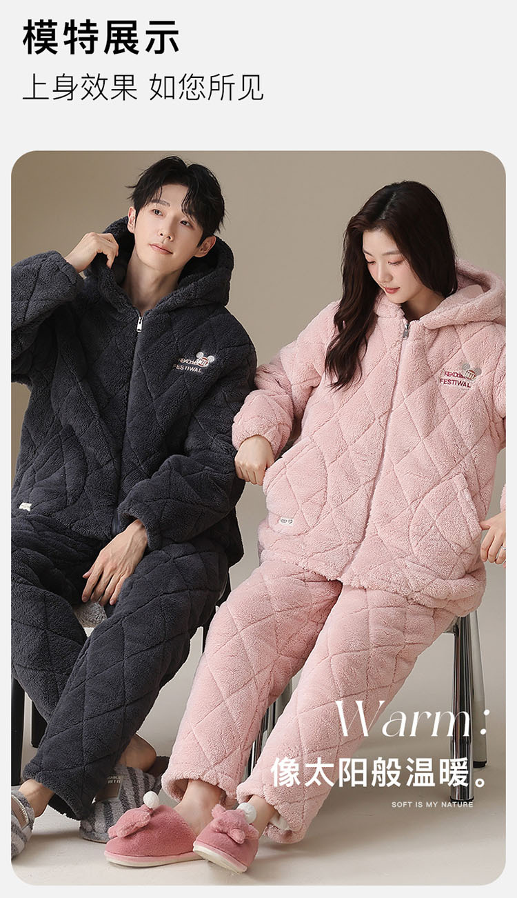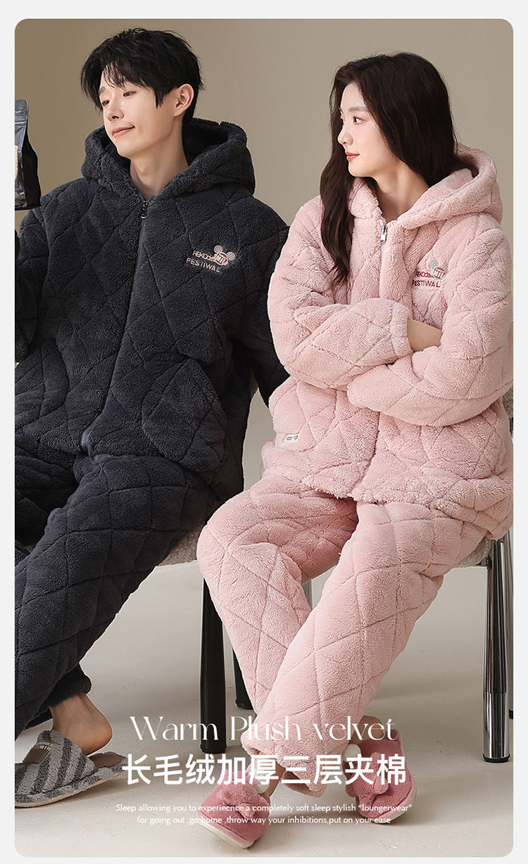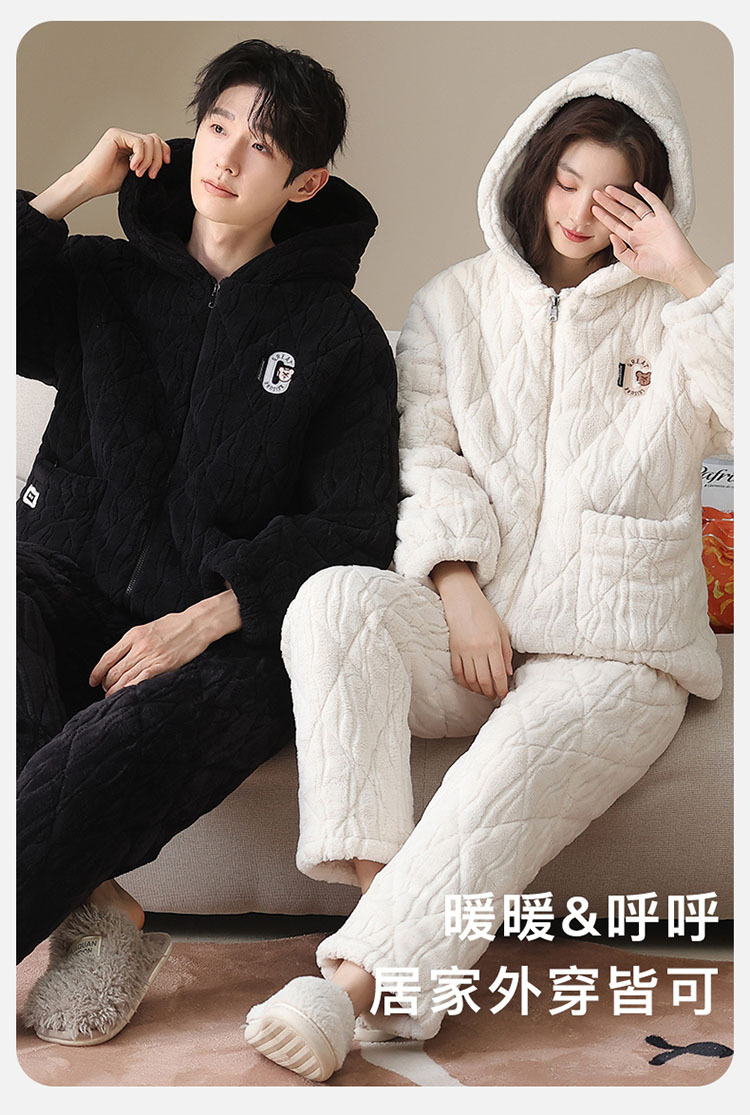 拉链连帽情侣睡衣三层夹棉云感绒套装女冬季加厚保暖男外穿居家服