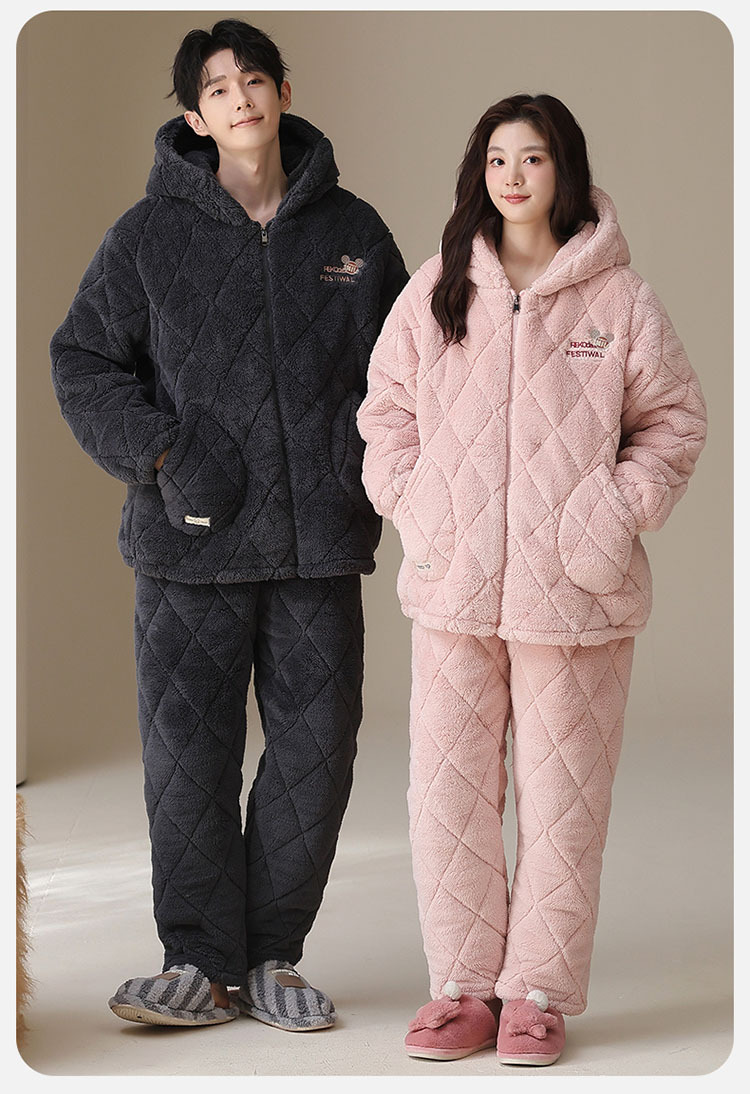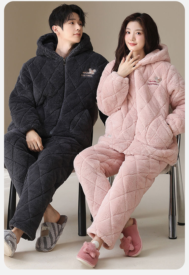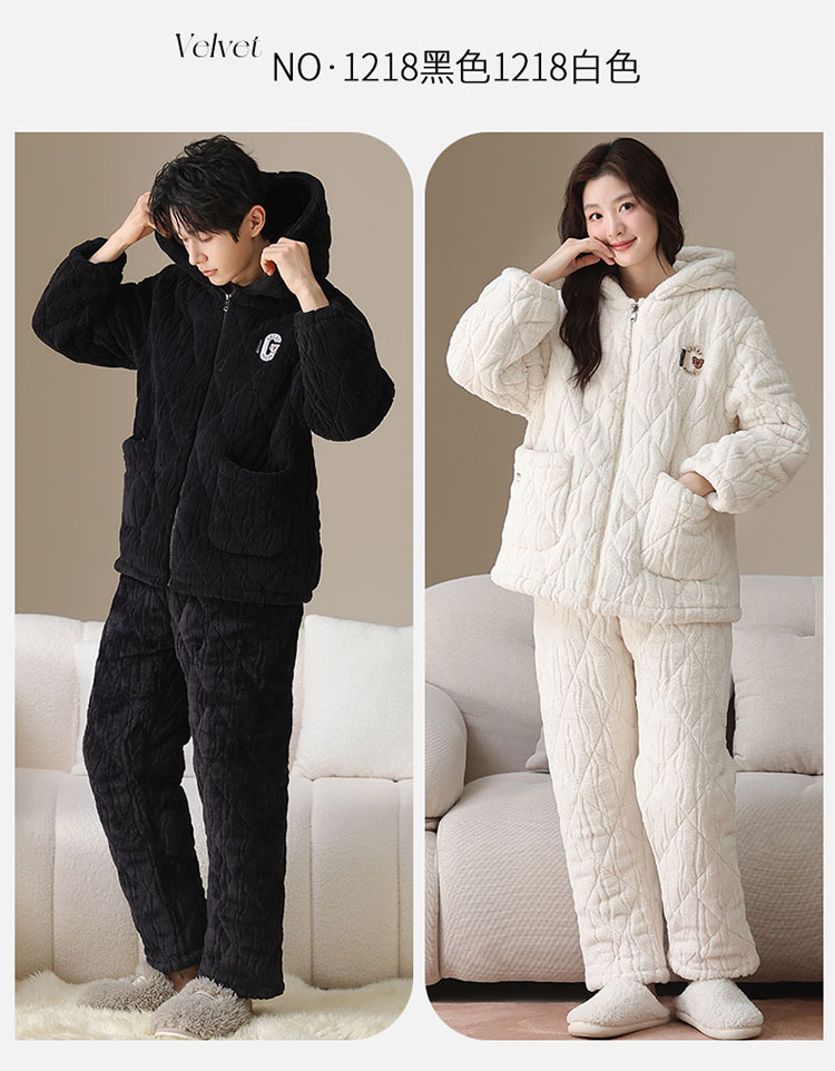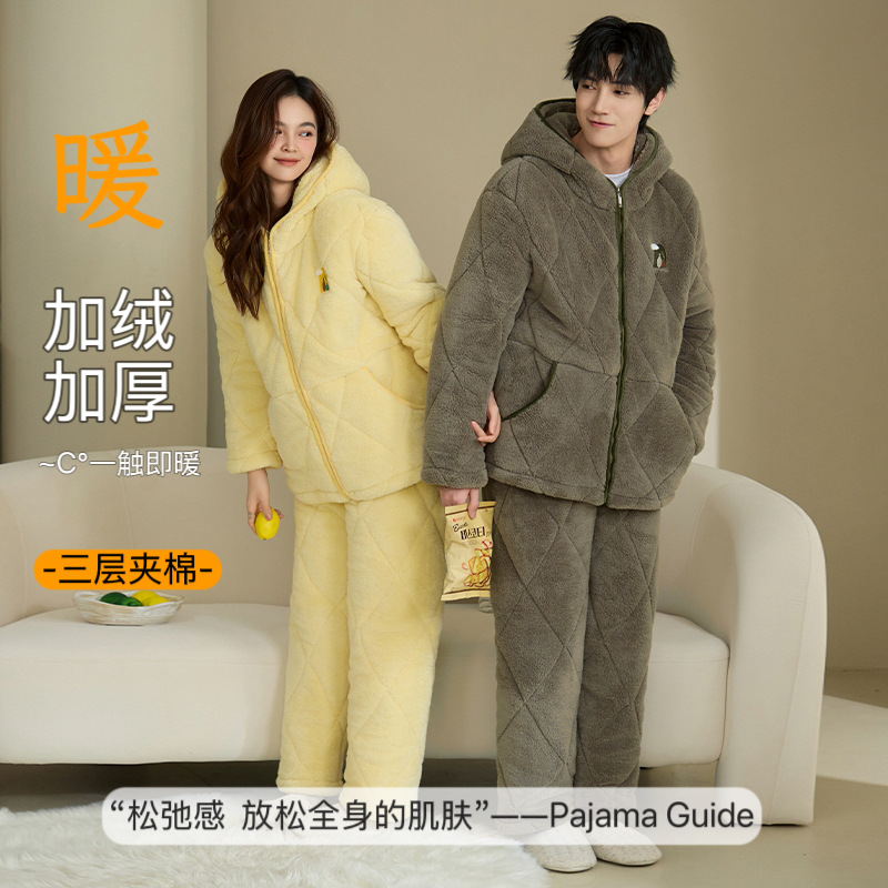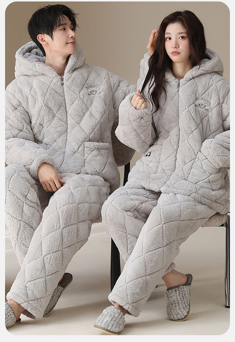 拉链连帽情侣睡衣三层夹棉云感绒套装女冬季加厚保暖男外穿居家服