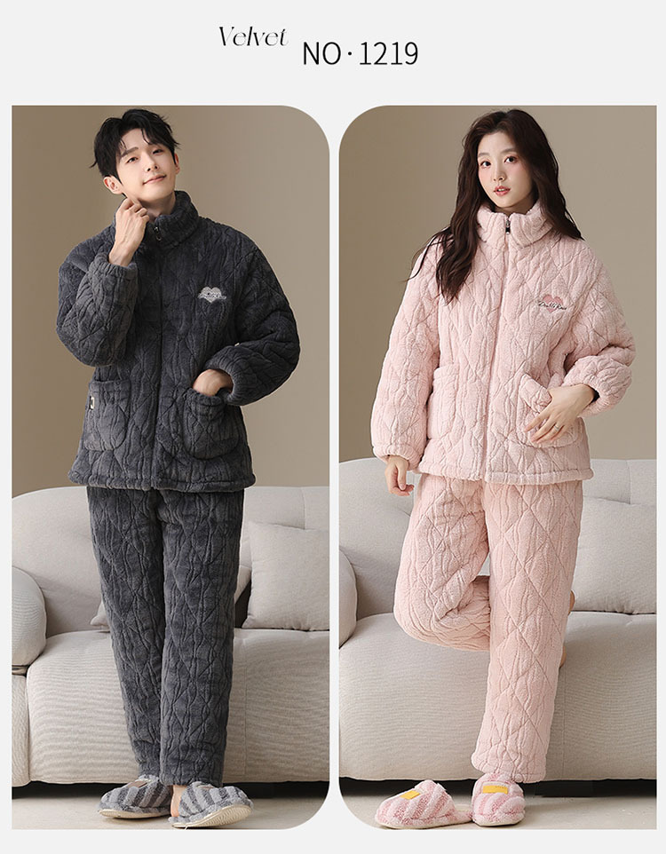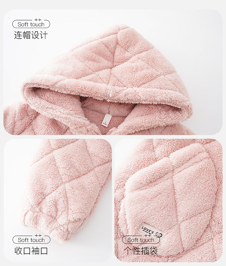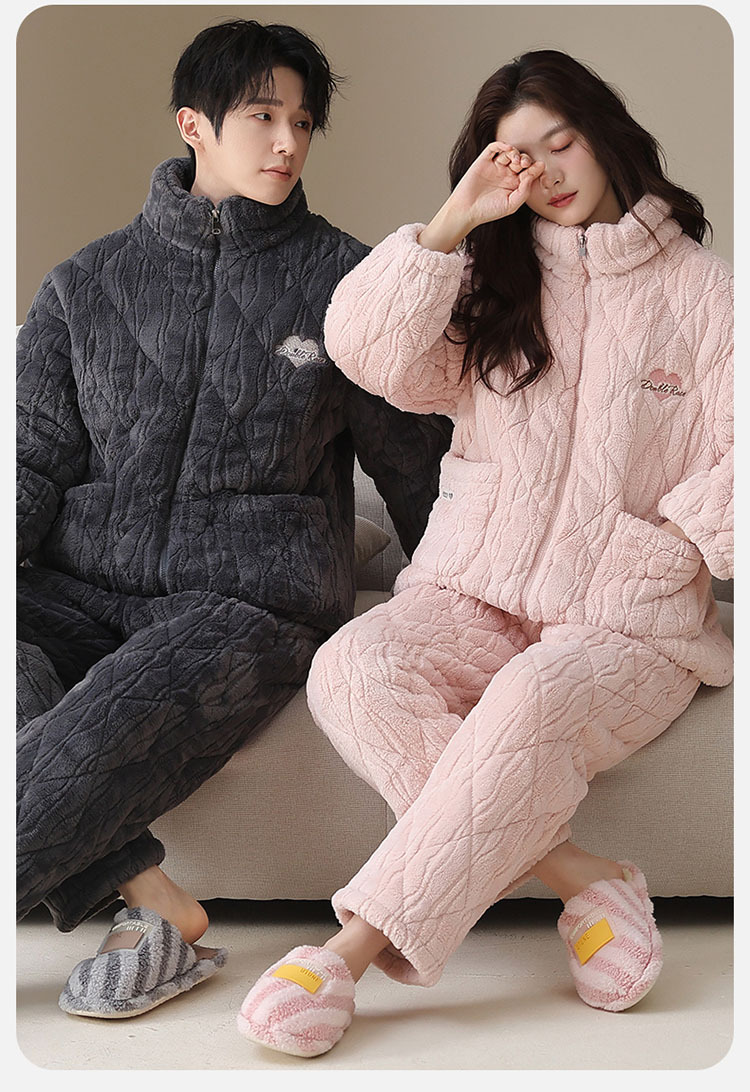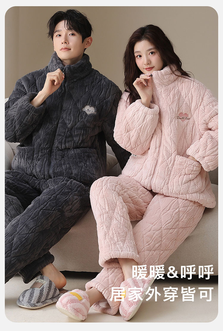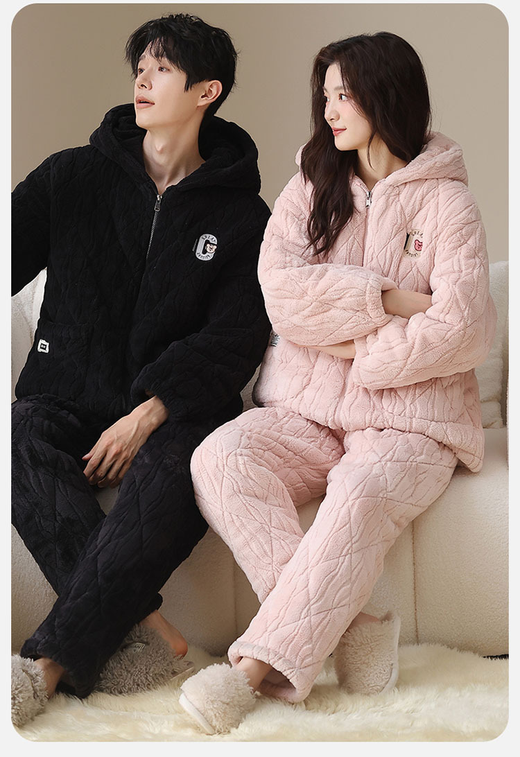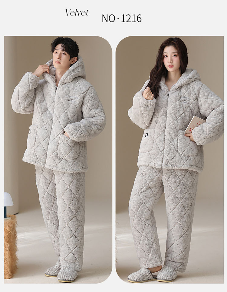 拉链连帽情侣睡衣三层夹棉云感绒套装女冬季加厚保暖男外穿居家服