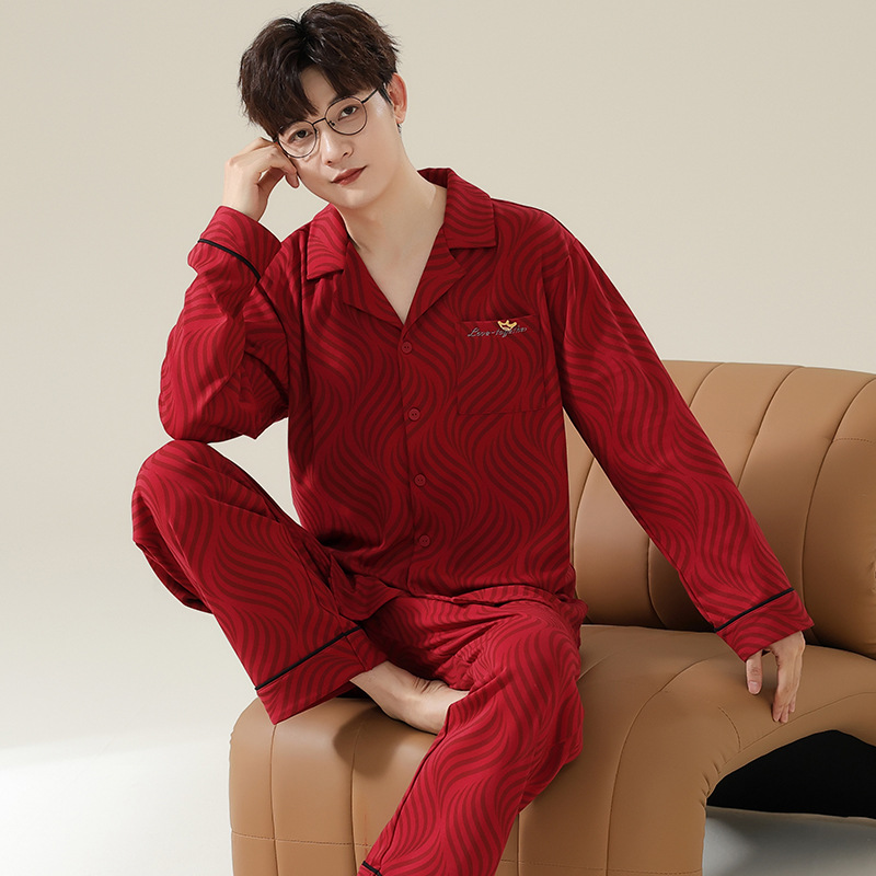 赤い本命年パジャマ男性秋冬綿質薄い長袖プラスサイズ新婚スーツ青中年ホームウェア