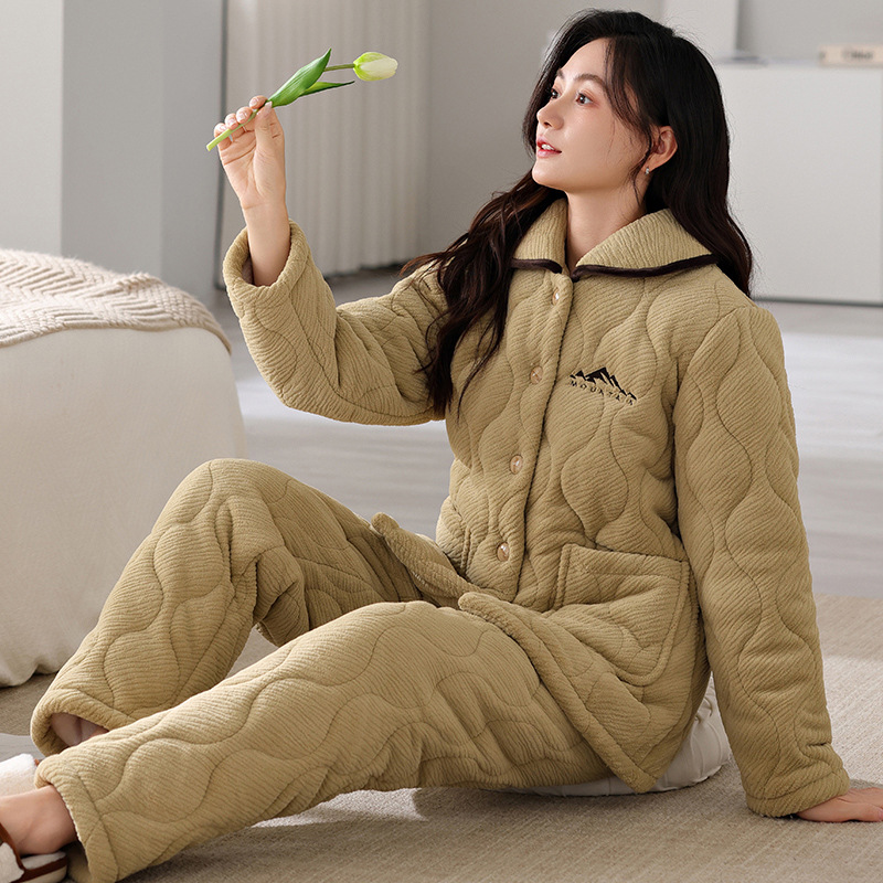 2024三層綿を挟んだ女性パジャマ冬の新しいサンゴのベルベットの厚いベルベットの家庭服の保温外着セット