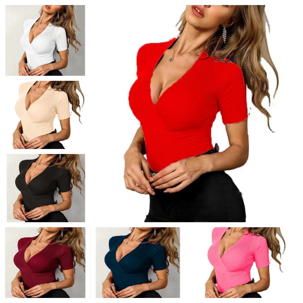 欧米の新型の2024夏の知的な風の気質のニットの頭のv字の襟の修身の女性のt字のメーカーの卸売り