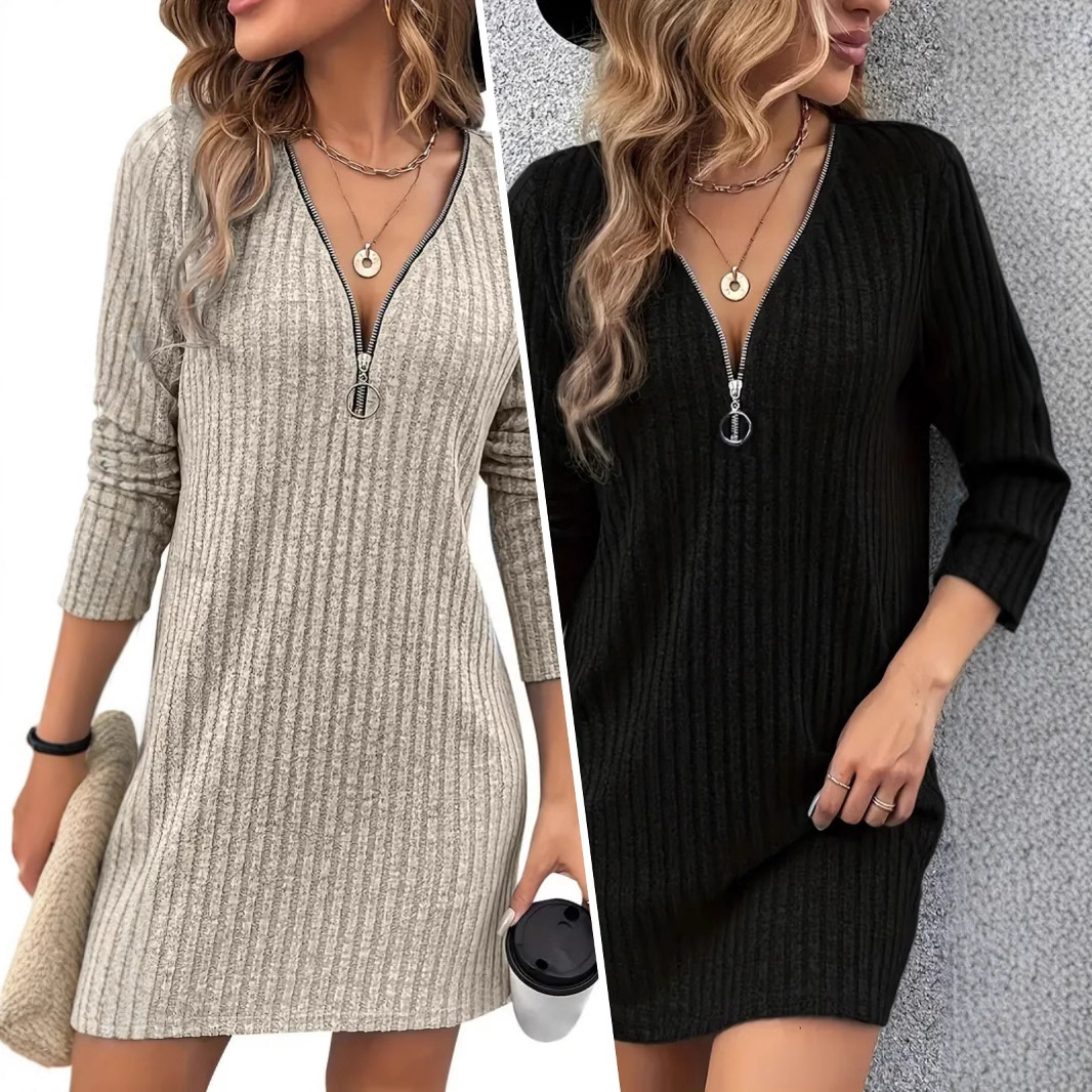 国境を越えた欧米ファッション優雅な春秋vネックファスナー坑条女性ワンピース杏色黒色快適カジュアル
