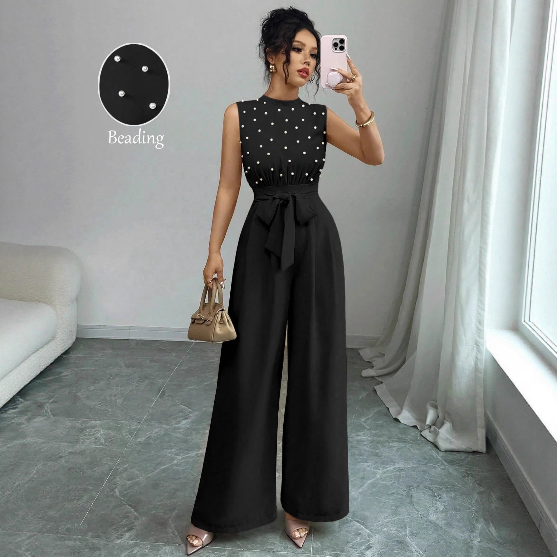 跨境欧美女装2025春夏女士优雅气质黑色波点圆领无袖阔腿连体裤