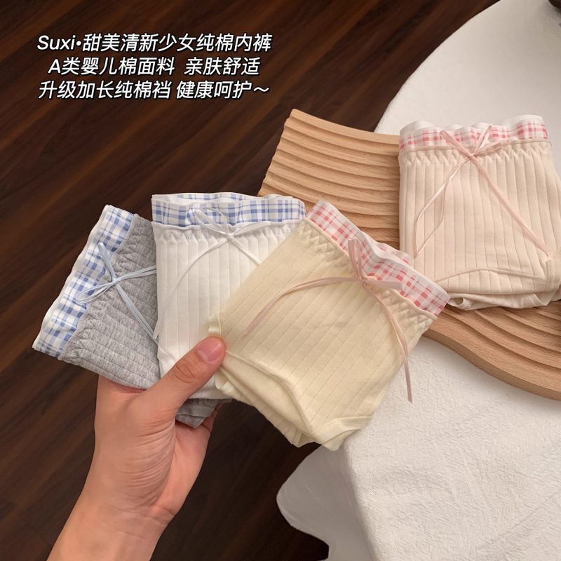 “桃心蓝格”10A抗菌全棉加长裆纯棉内裤女生微甜小调纯棉三角裤