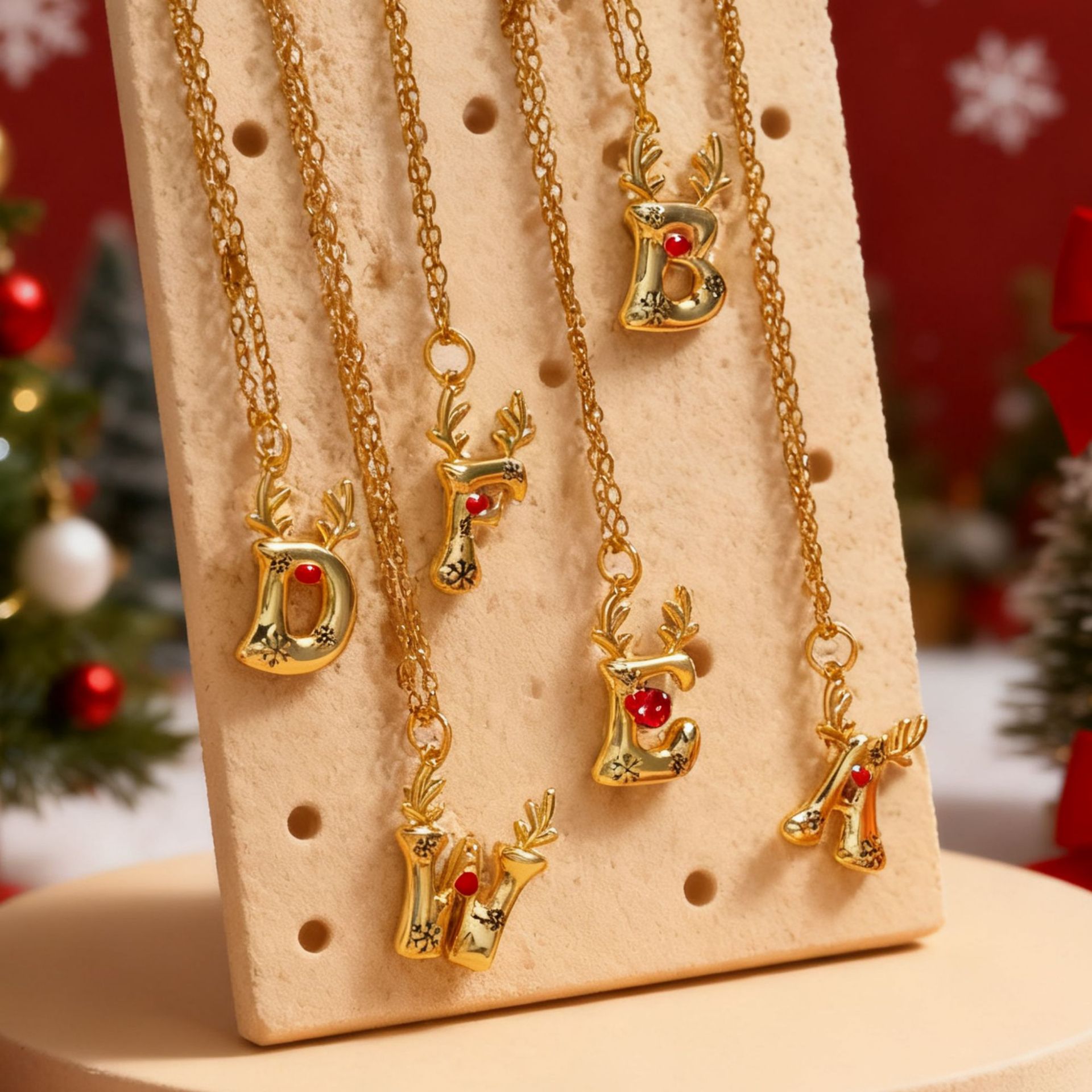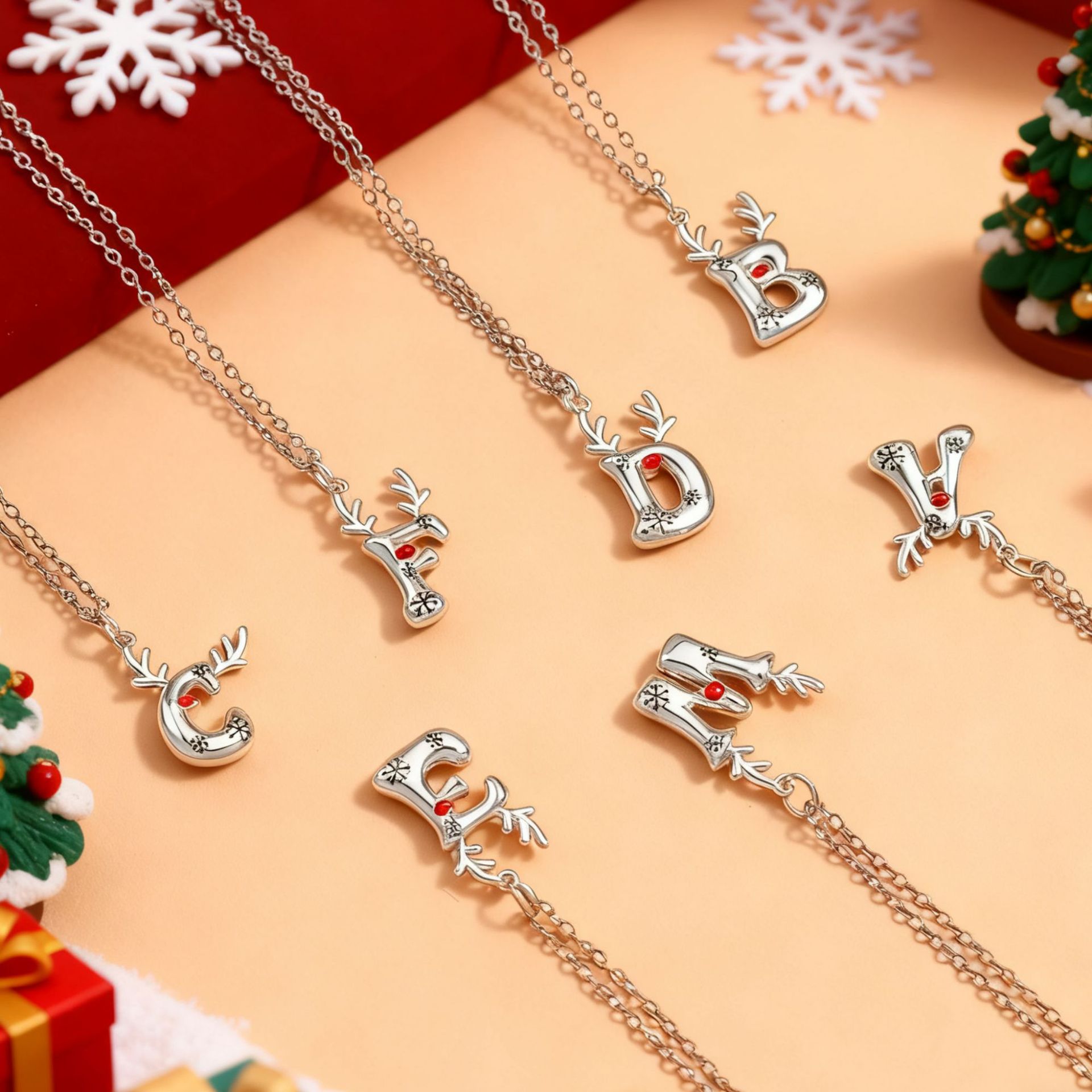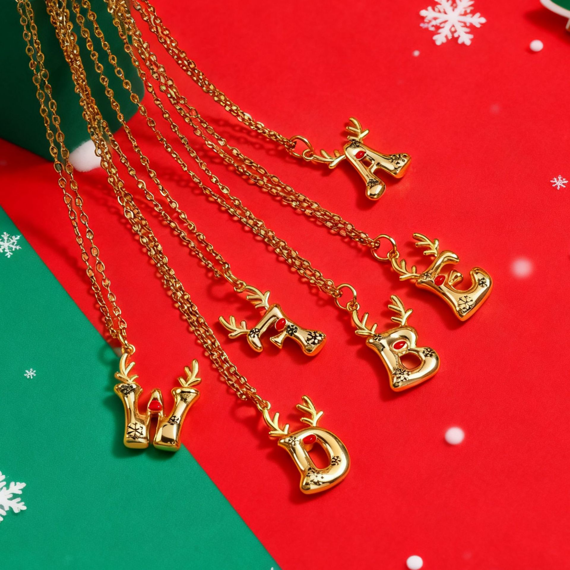欧美跨境麋鹿圣诞字母项链可爱精致雪花鹿角圣诞节英文字母项链女