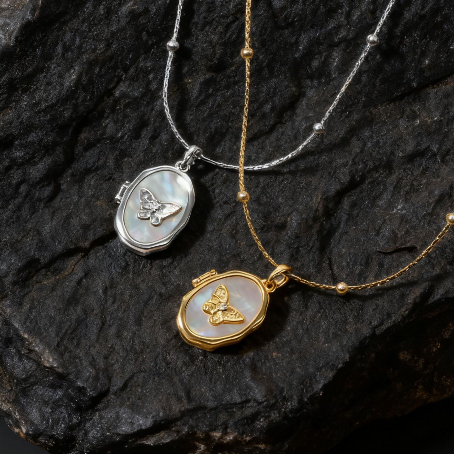 アマゾンで人気のクロスボーダー商品、蝶のフォトボックス、貝殻のフォトアルバムネックレス、携帯用フォトボックス、開閉式ペンダントネックレス
