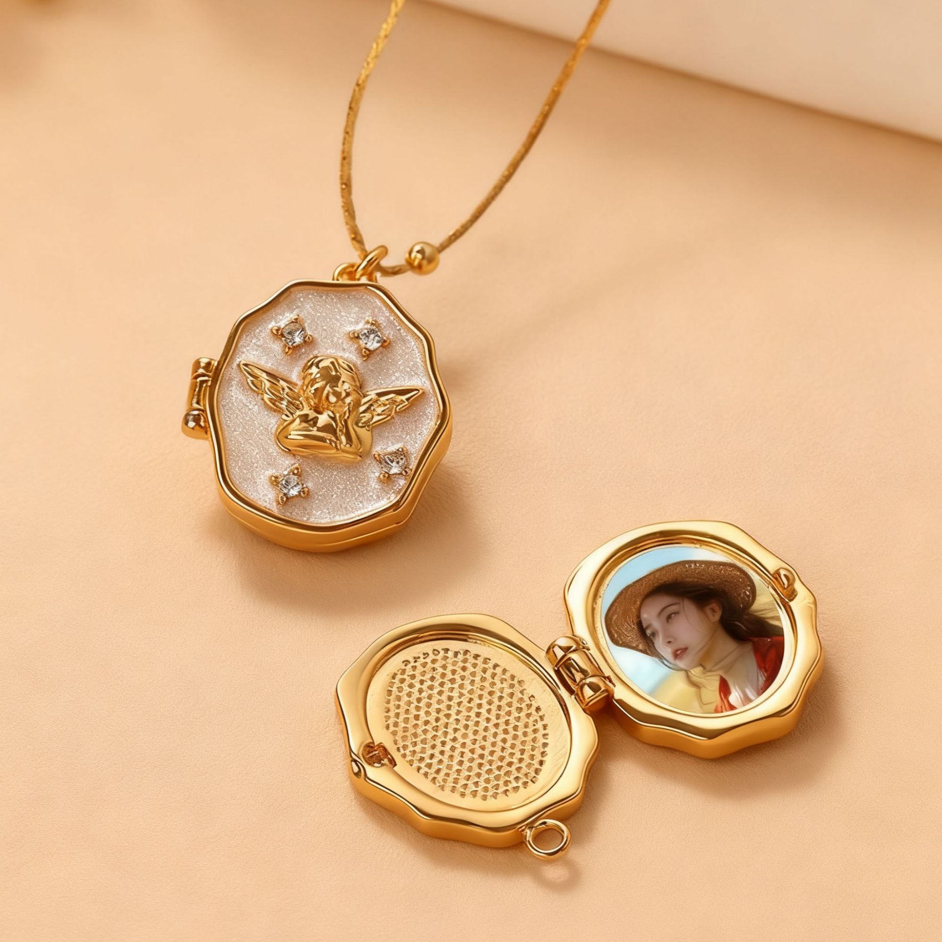 国境を越えた人気のフォトボックスネックレス電気メッキ色保存パーソナライズされたエンジェルペンダントポータブル開閉可能な記念フォトアルバムネックレス