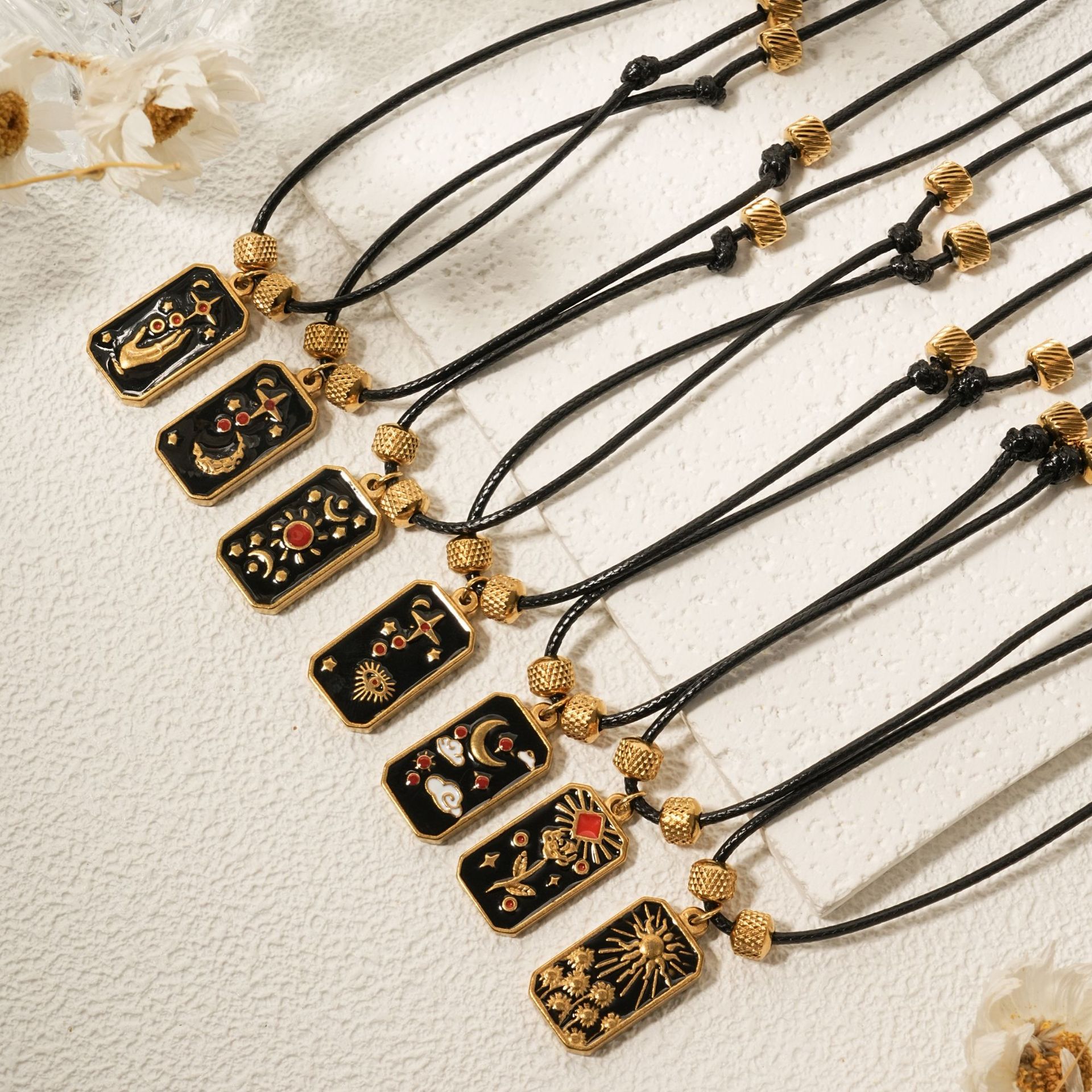 欧美时尚复古不锈钢项链塔罗牌黑色滴油皮革绳手工打结塔罗牌项链