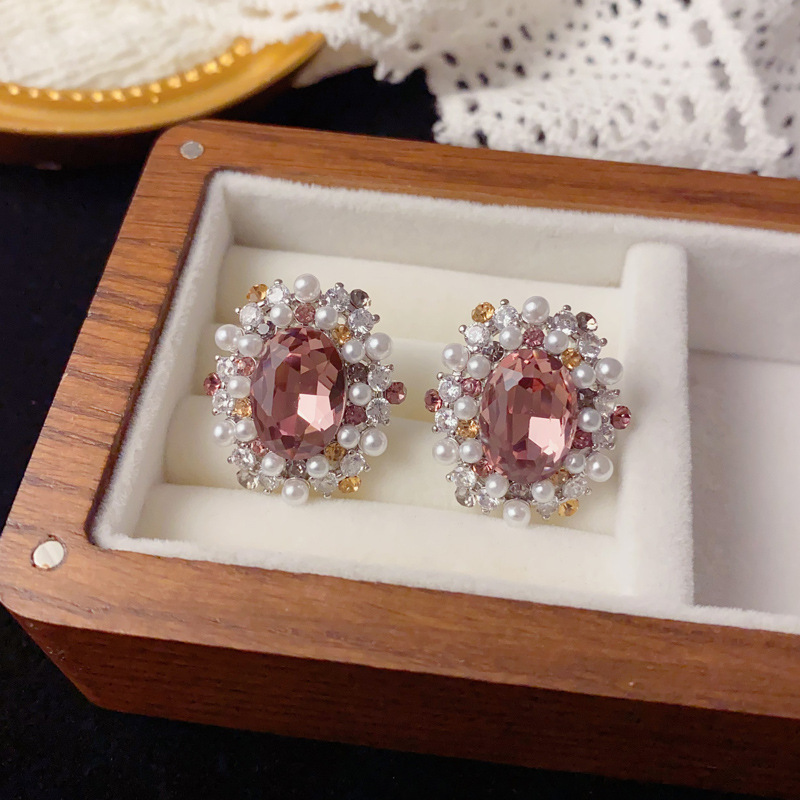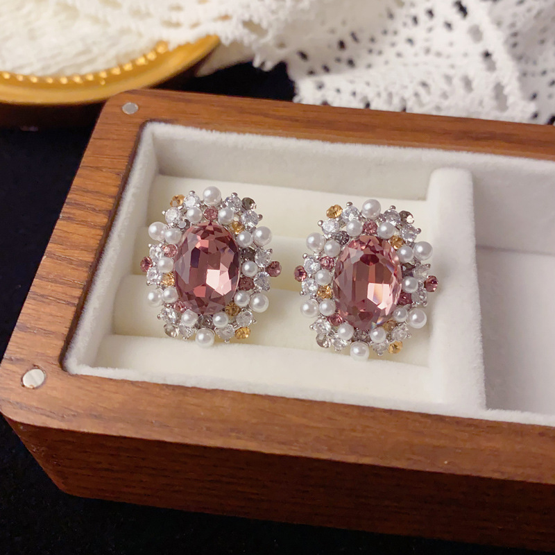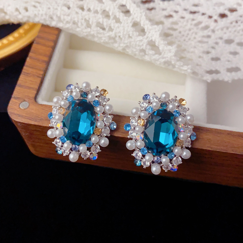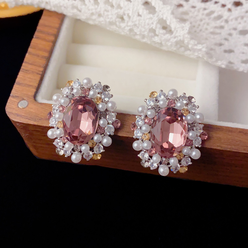 法式轻奢满钻珍珠椭圆耳钉女精致个性时尚百搭高级感超闪耳环批发