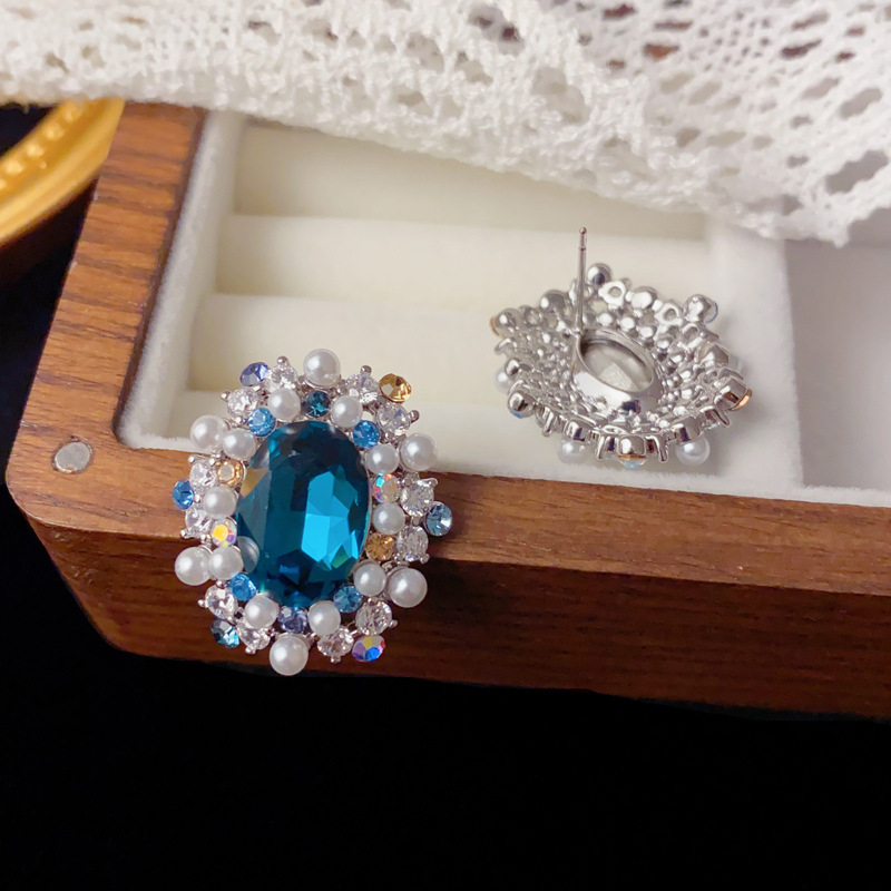 法式时尚高级感锆石环绕蓝钻耳钉女精致气质独特设计百搭超闪耳环