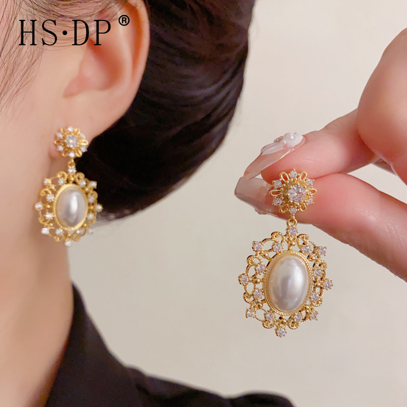 欧美跨境镶钻珍珠椭圆花瓣耳坠女复古时尚宫廷风设计感耳环批发