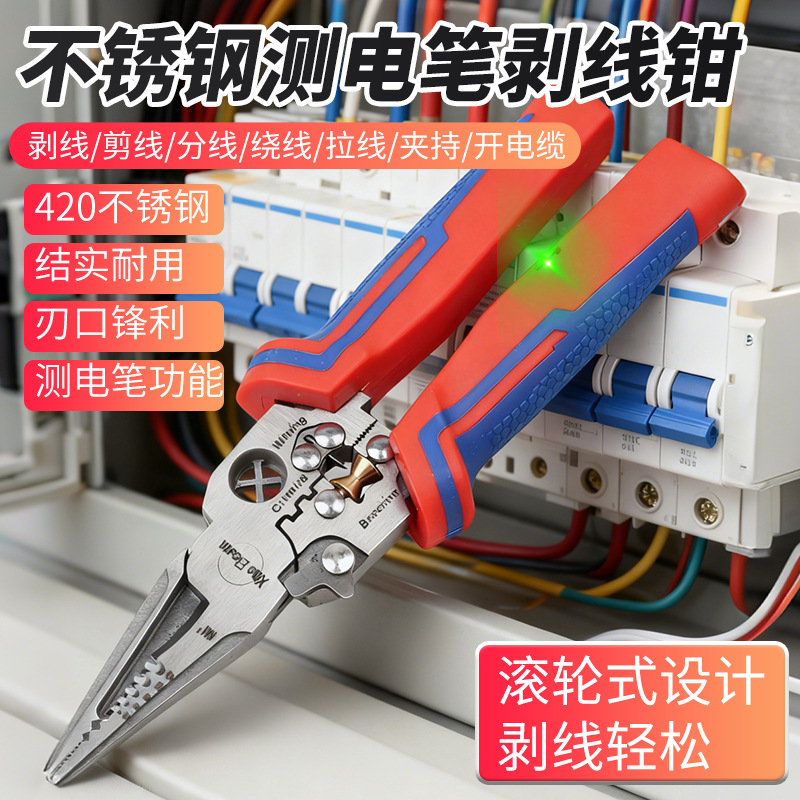 新款加厚(不锈钢)测电剥线钳工业级多功能扒皮分线绕线滑轮剥线