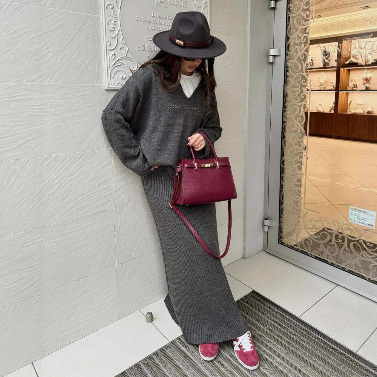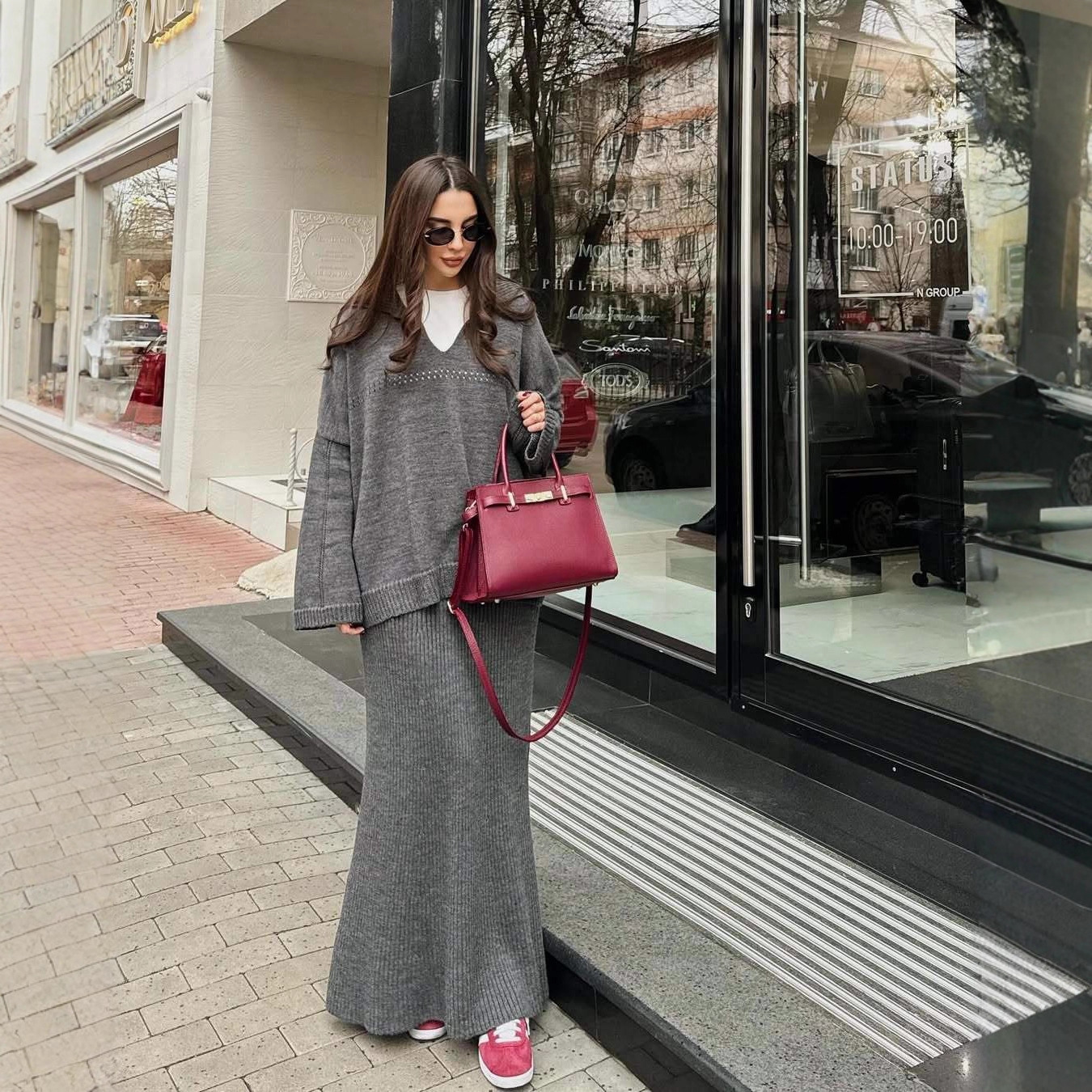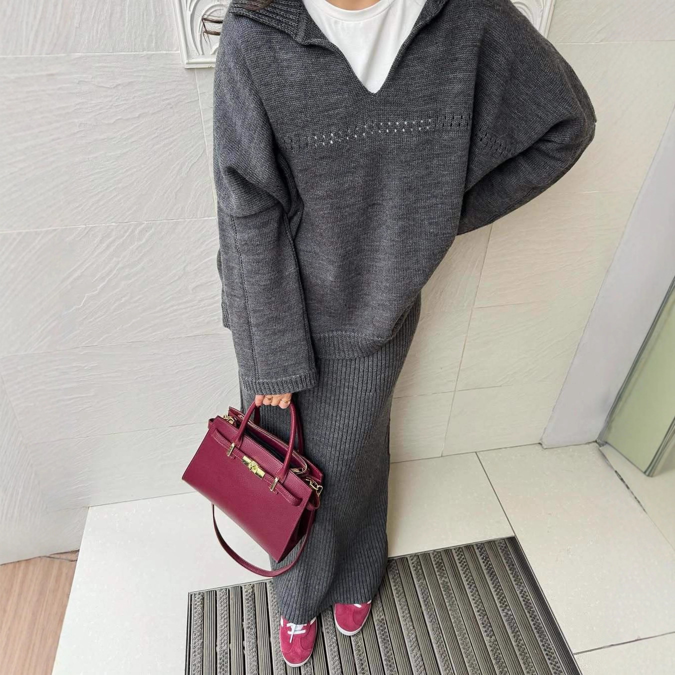 2025秋冬欧美跨境外贸女装时尚显瘦V领针织套头毛衣长款半裙套装