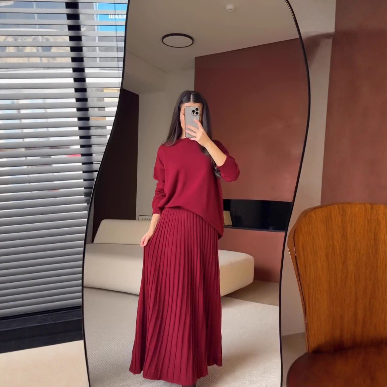 跨境外贸女装亚马逊2025秋新款针织毛衣圆领长袖气质休闲百褶裙