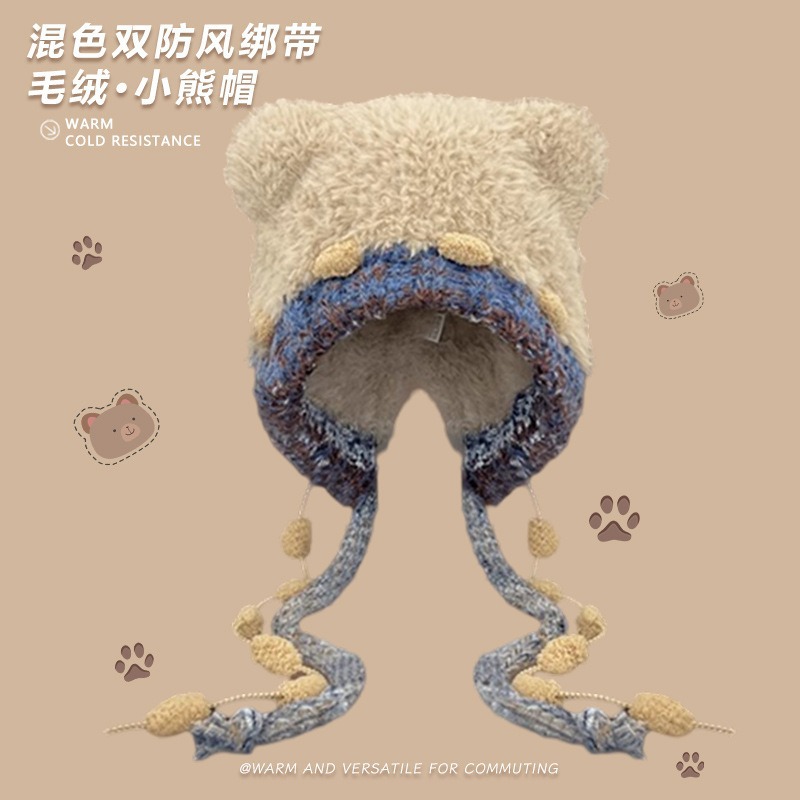 可爱拼色加厚毛绒小熊耳朵毛线帽子女秋冬季保暖护耳显脸小雷锋帽