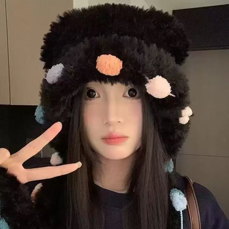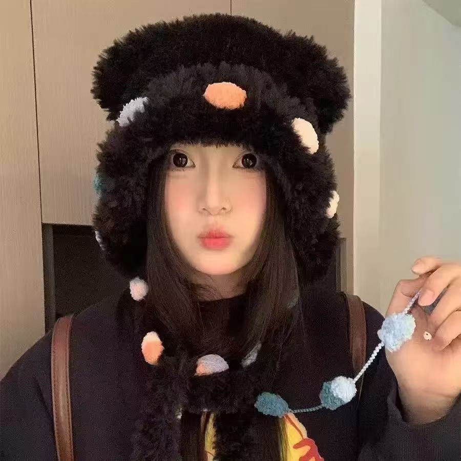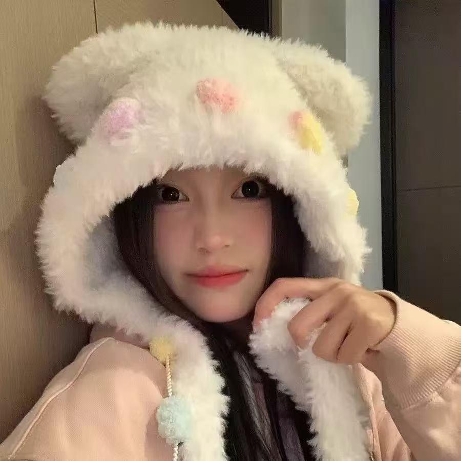 可爱彩色毛绒小熊耳朵毛线帽子女秋冬季加厚保暖显脸小护耳雷锋帽