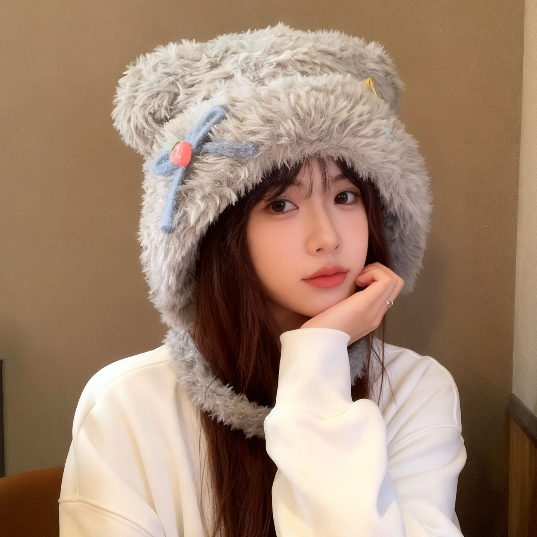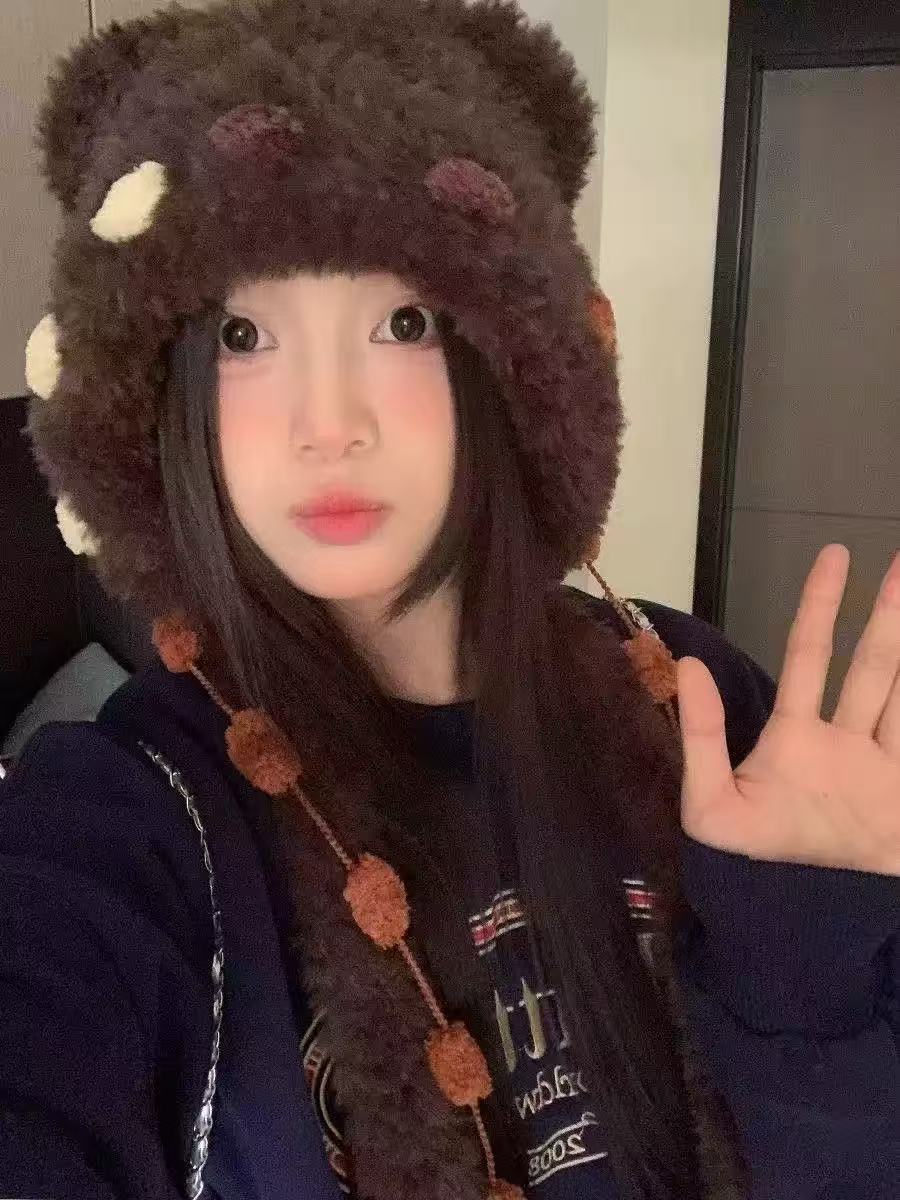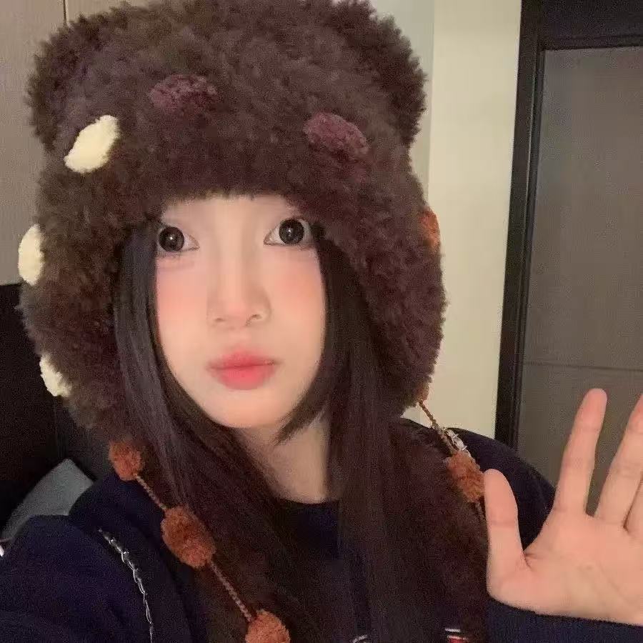 小熊耳朵毛绒帽子女2025年秋冬季可爱显脸小帽子保暖护耳雷锋帽潮
