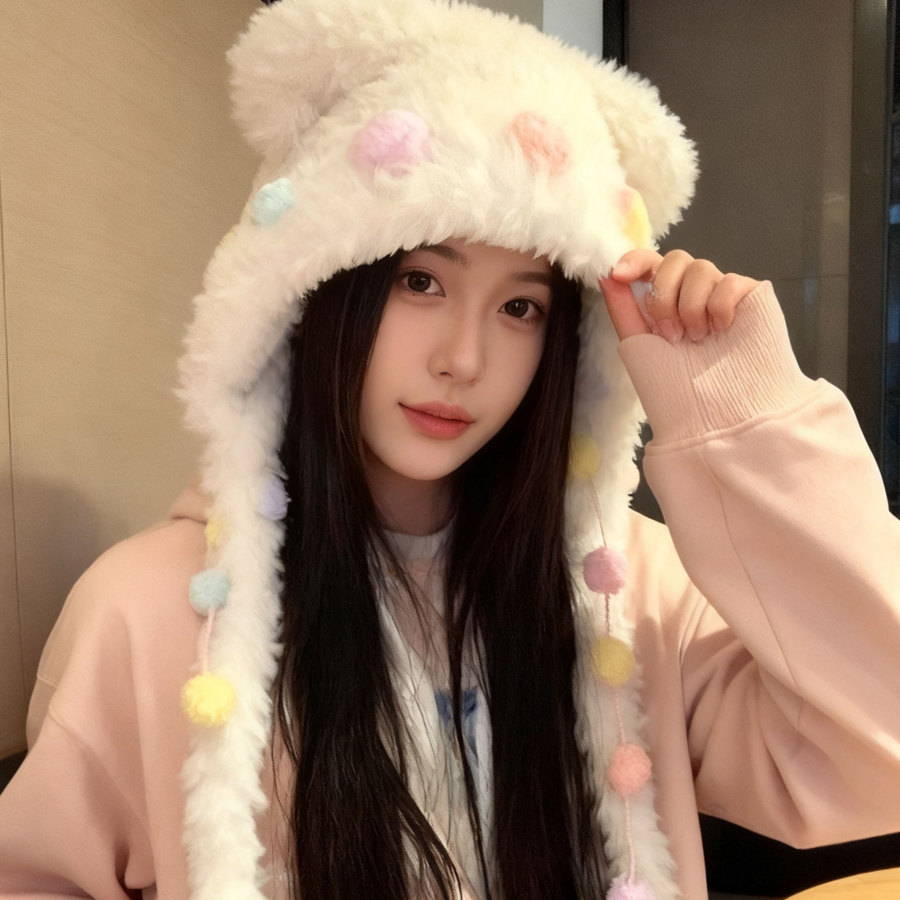 甜美日系可爱毛茸茸小熊耳朵雷锋帽子女秋冬季保暖彩色绑带护耳帽