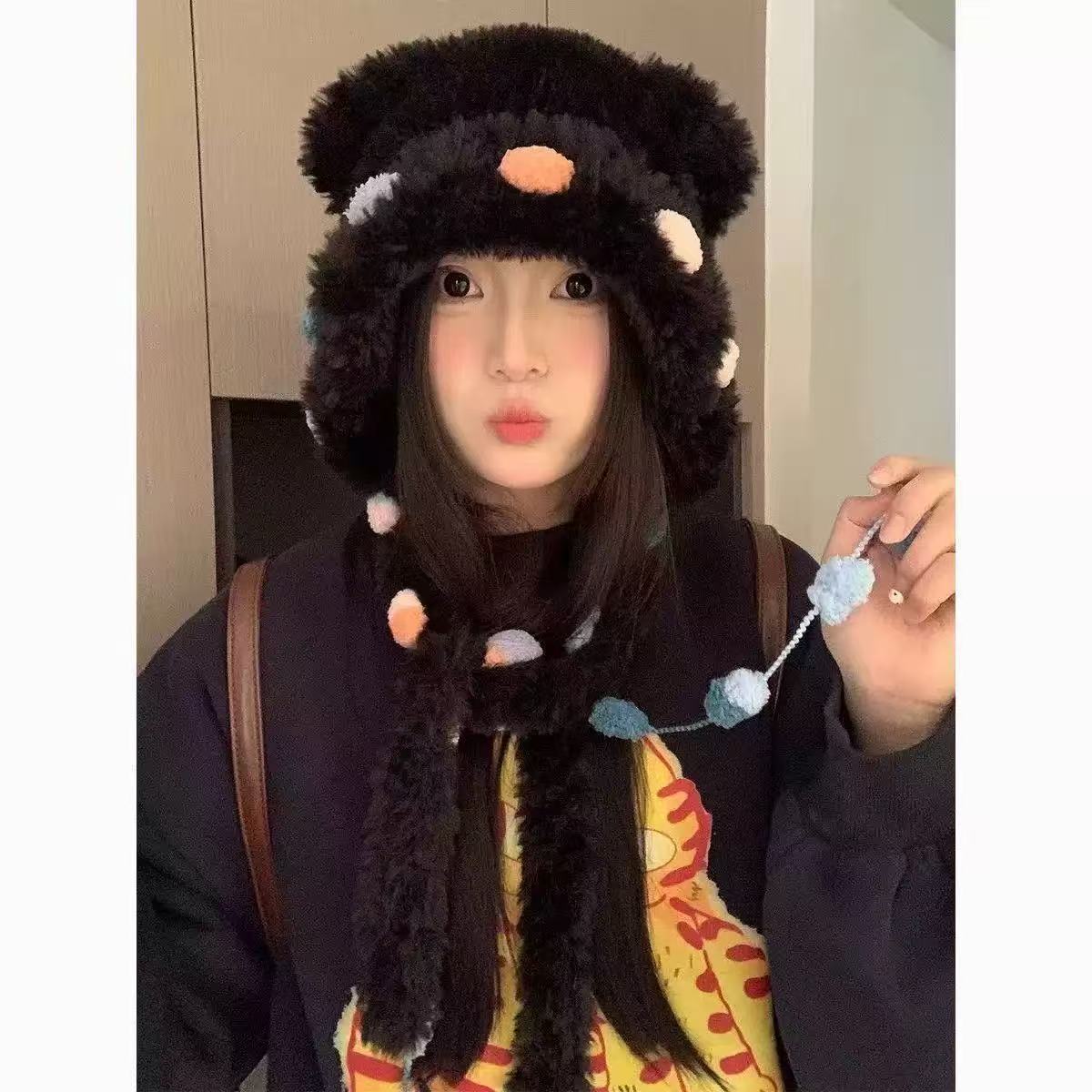 韩版可爱毛茸茸毛线帽女冬撞色流苏户外大头围加厚保暖套头护耳帽
